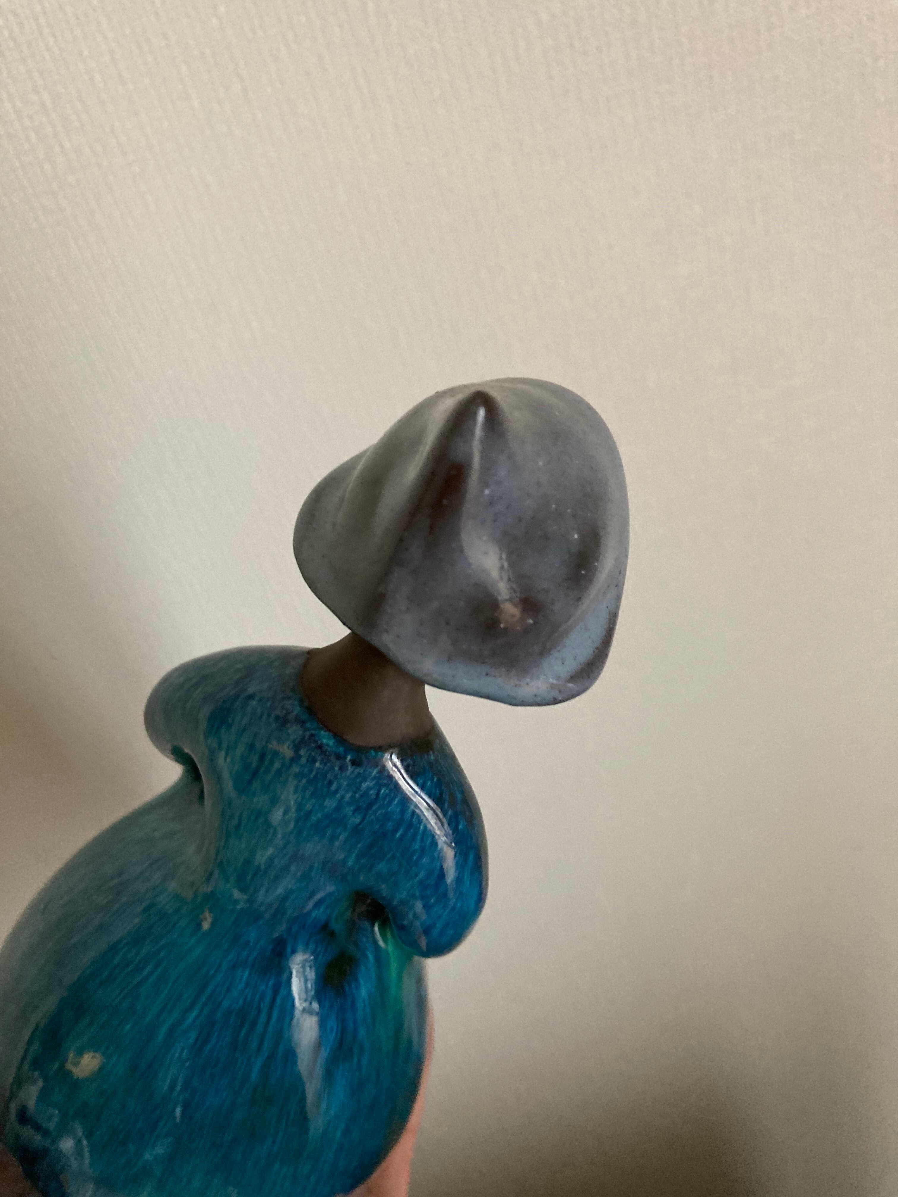 洋服の艶やかな釉薬と、顔と手の素焼きの組み合わせが素朴で可愛らしい一品。