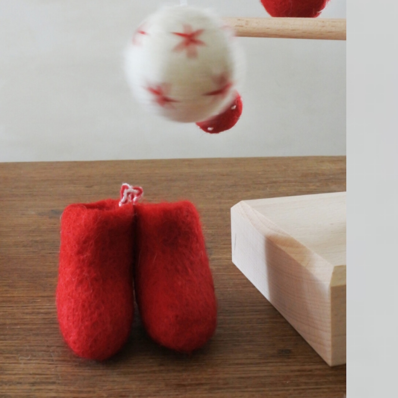 それぞれに、ふんわりフェルト玉のオーナメントと、小さなフェルトブーツ付き。赤バージョンには赤ブーツ、グレーバージョンには白ブーツがセット。