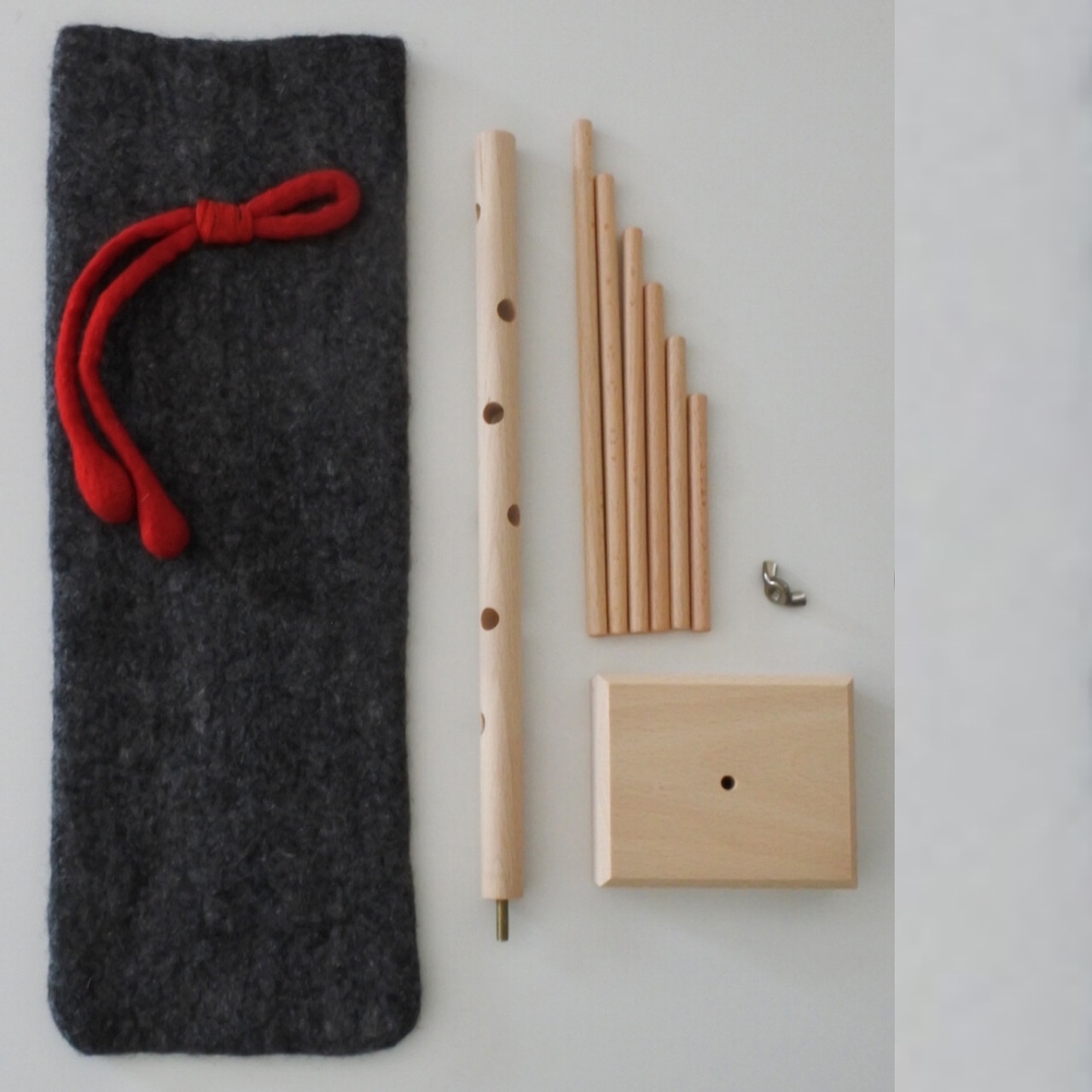高さ約37cm、横幅は一番長い棒が約23cmとコンパクト。木製の組み立て式で縦の棒と台座は裏側からネジで止めるようになっています。