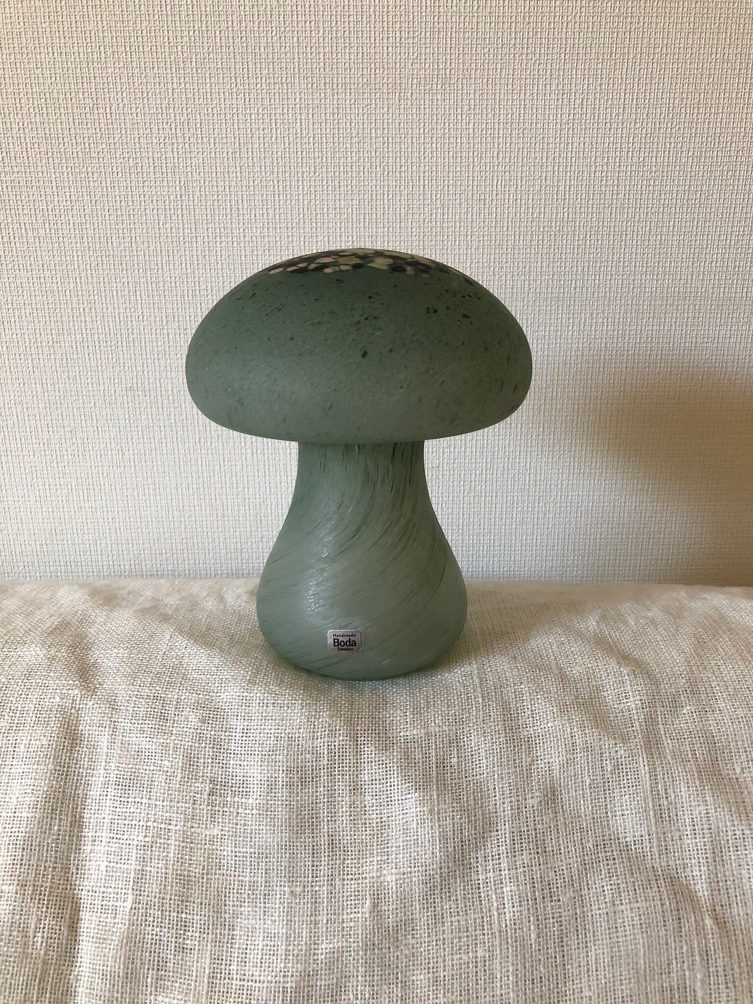 Monica Backstrom デザインのキノコのオブジェは大小、色、さまざまありますが、こちらは、高さが約19㎝あり、大きめのタイプで、あまり見ないレアなアイテムです♫ 存在感はありますが、色味が薄めなので、飾りやすく、インテリアのアクセントにおススメです♫ 北欧ヴィンテージのガラスアイテムとも相性抜群です。