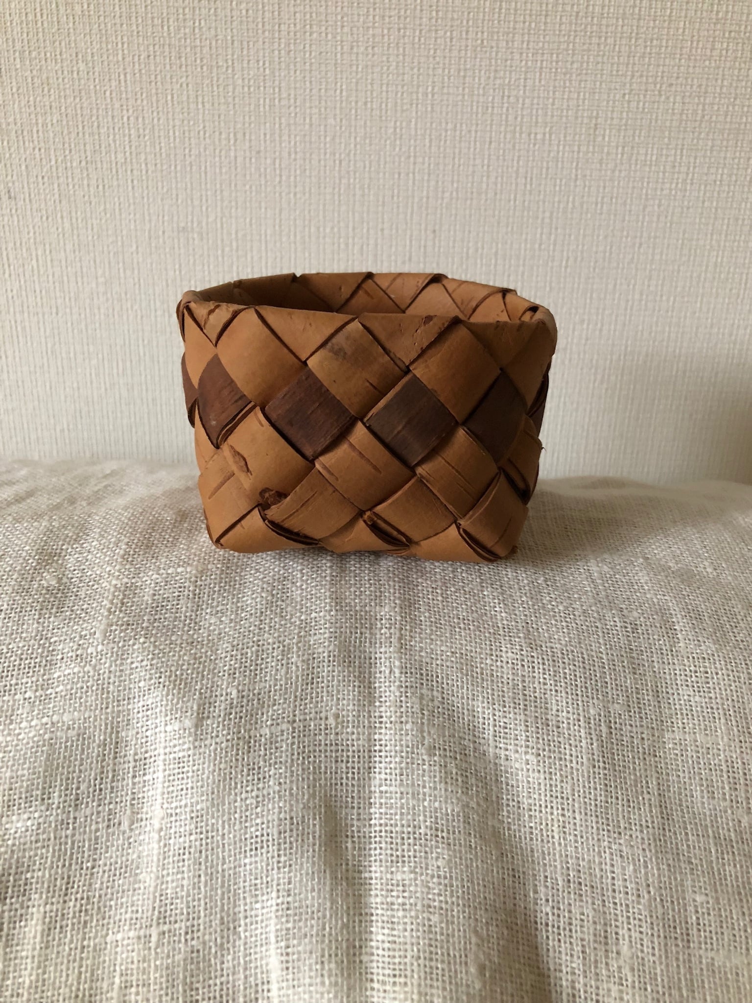 時を経たヴィンテージの白樺の風合いが素敵な一品です。 こちらは、真ん中だけ、色が濃い皮で編まれており、模様のようになっています♫