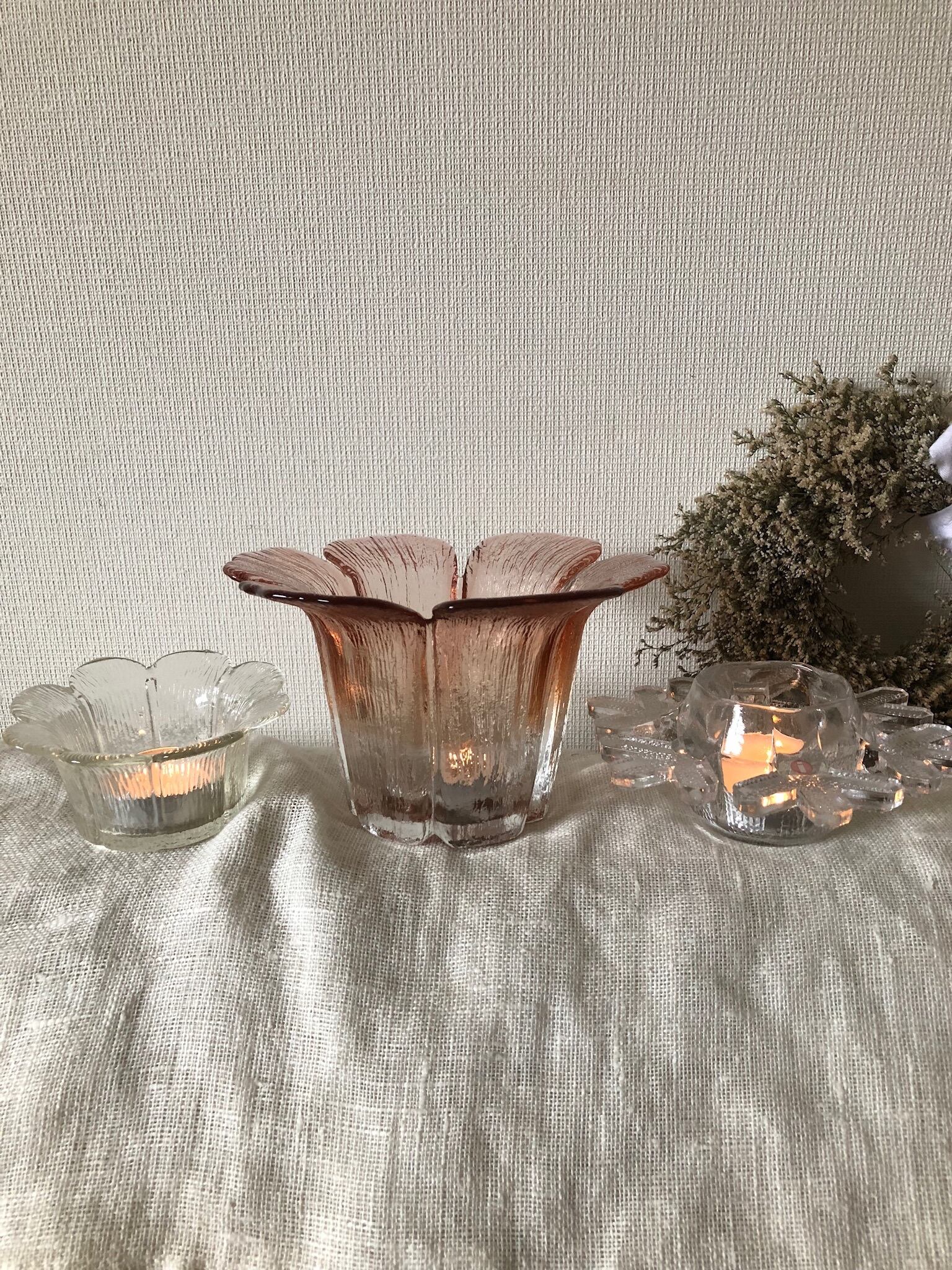 クリアなガラスと、花びらのサーモンピンクのグラデーションがとても綺麗なキャンドルホルダー♫