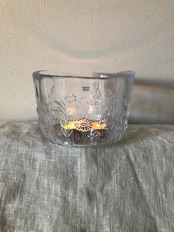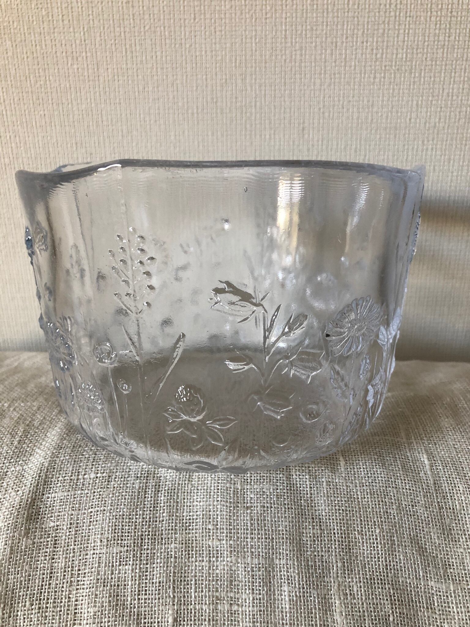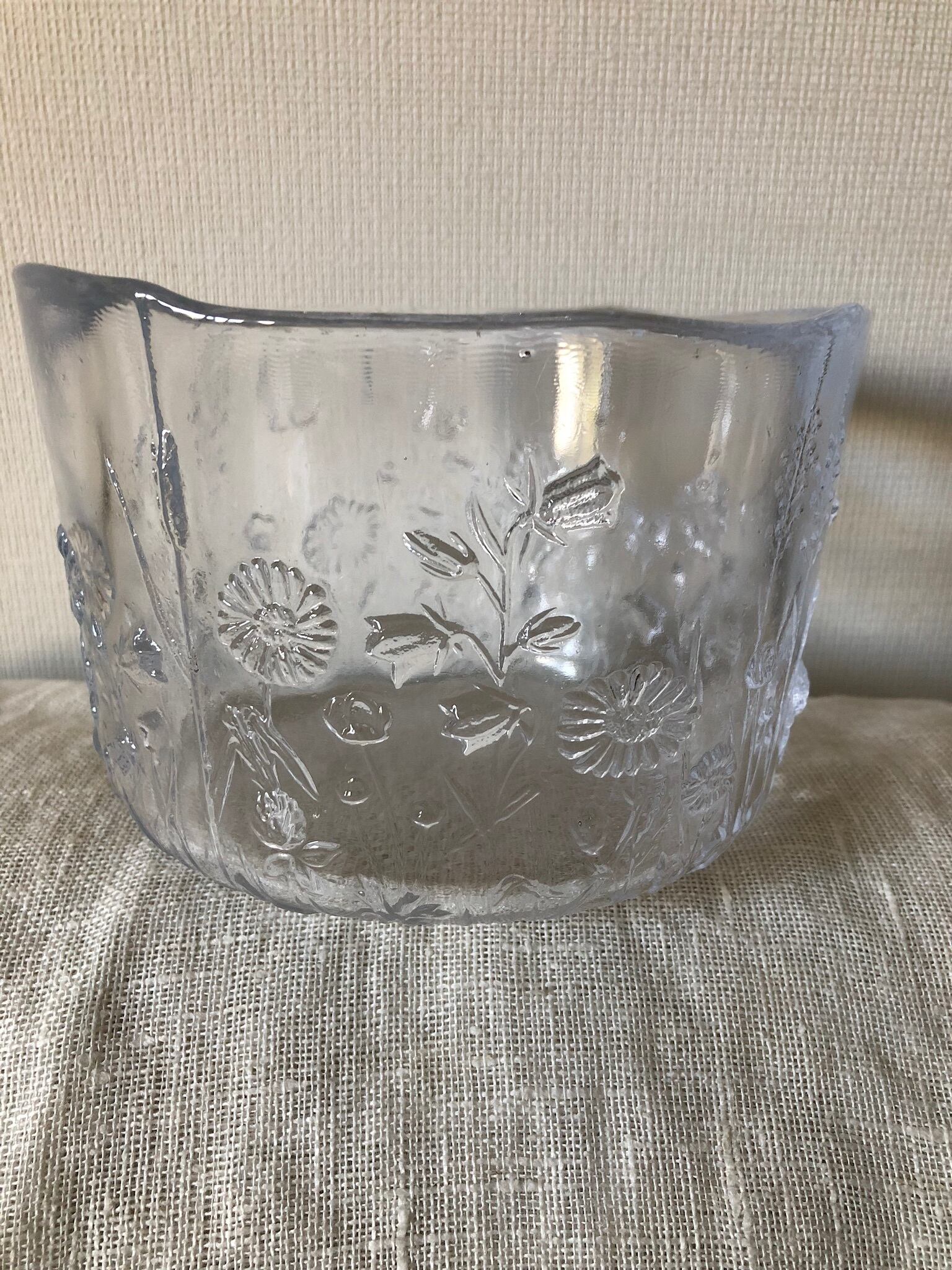 ぽってりした厚めのクリアなガラスに、蝶々とデイジーなどスウェーデンの草花7種類の立体的な模様が素敵なボウル。