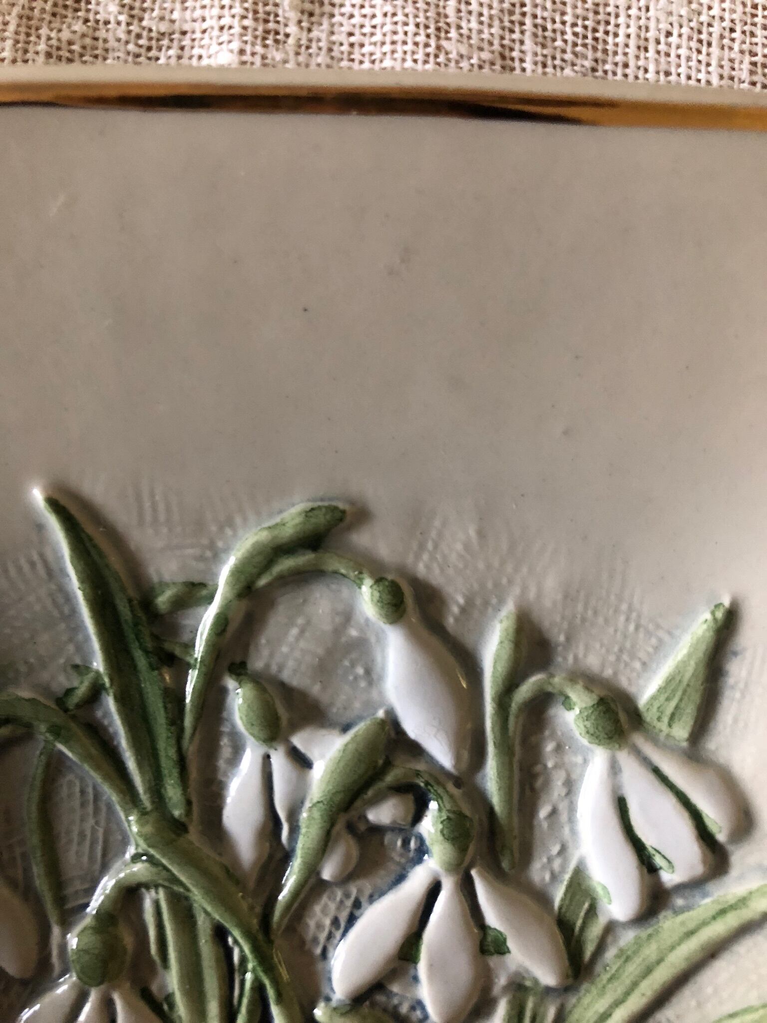 一年の月のお花シリーズの壁掛けプレートで、こちらは1月のスノードロップの柄になります。左下に スノードロップ 1月 とシールで貼ってあります♫