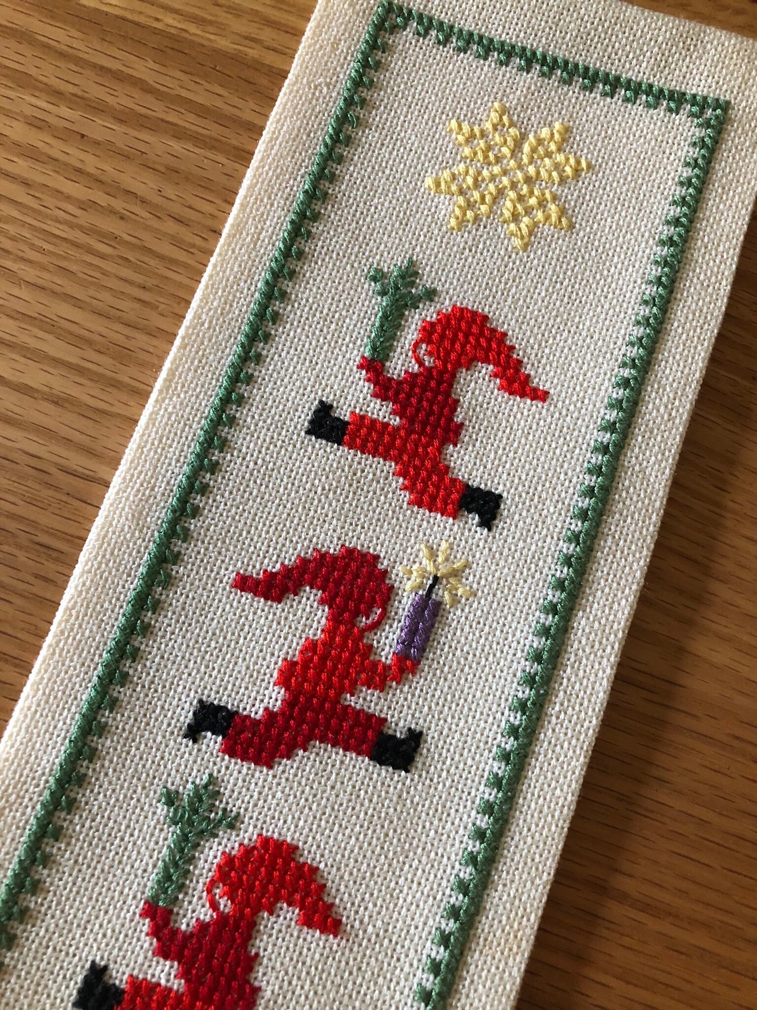 オフホワイトのリネン生地に、ロウソクとヒイラギを持ったトムテと星の刺繍が、とても凝っていて可愛らしいクリスマスのタペストリーです♫ 細長いので、ちょっとしたスペースに飾りやすいサイズ。裏地も付いていて、しっかりしています。