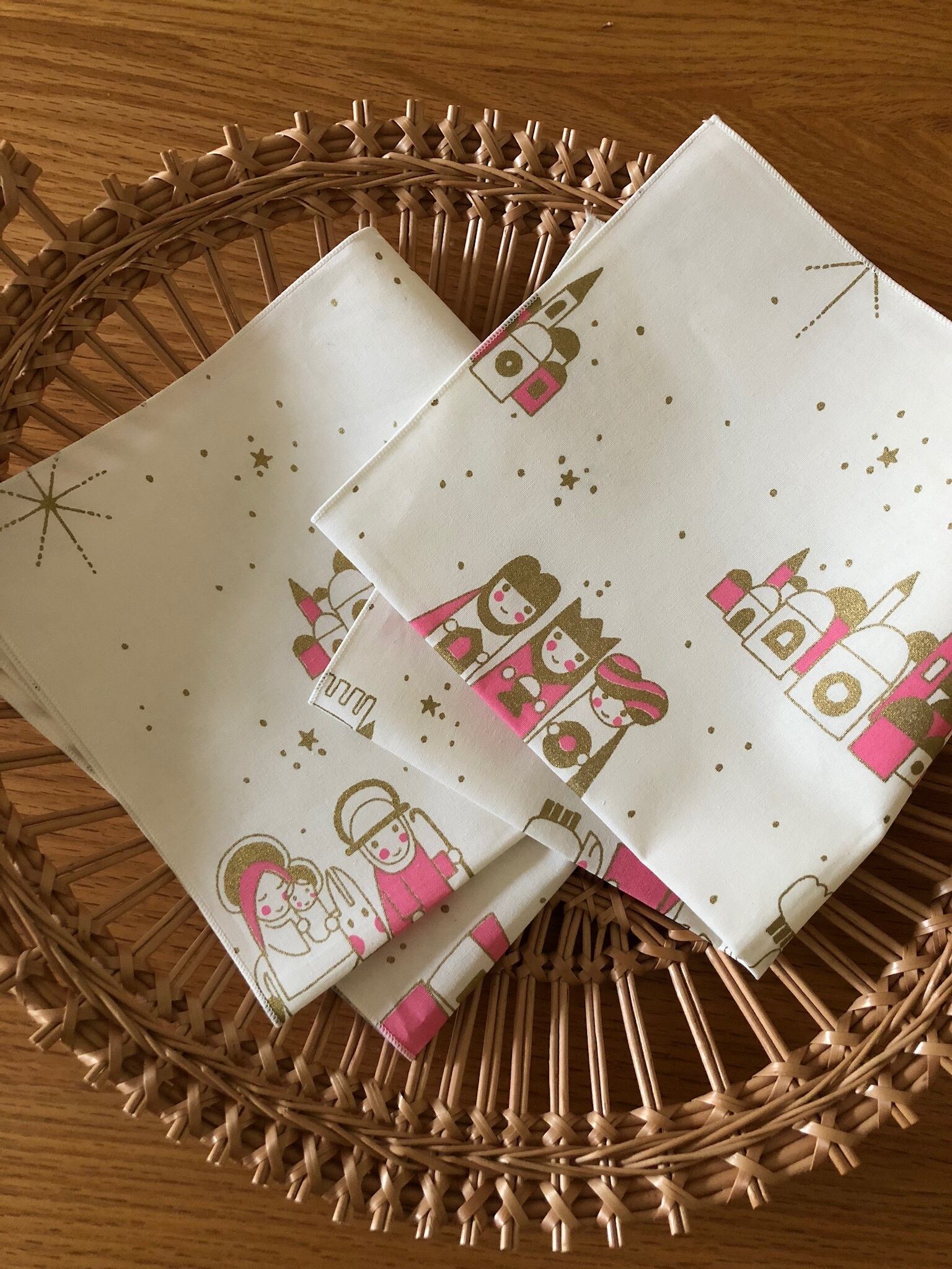白地にゴールドのベツレヘムの星と、キリスト誕生のイラストが、ピンクの色も相まって、とても可愛らしいクリスマスのコットンクロスになります。