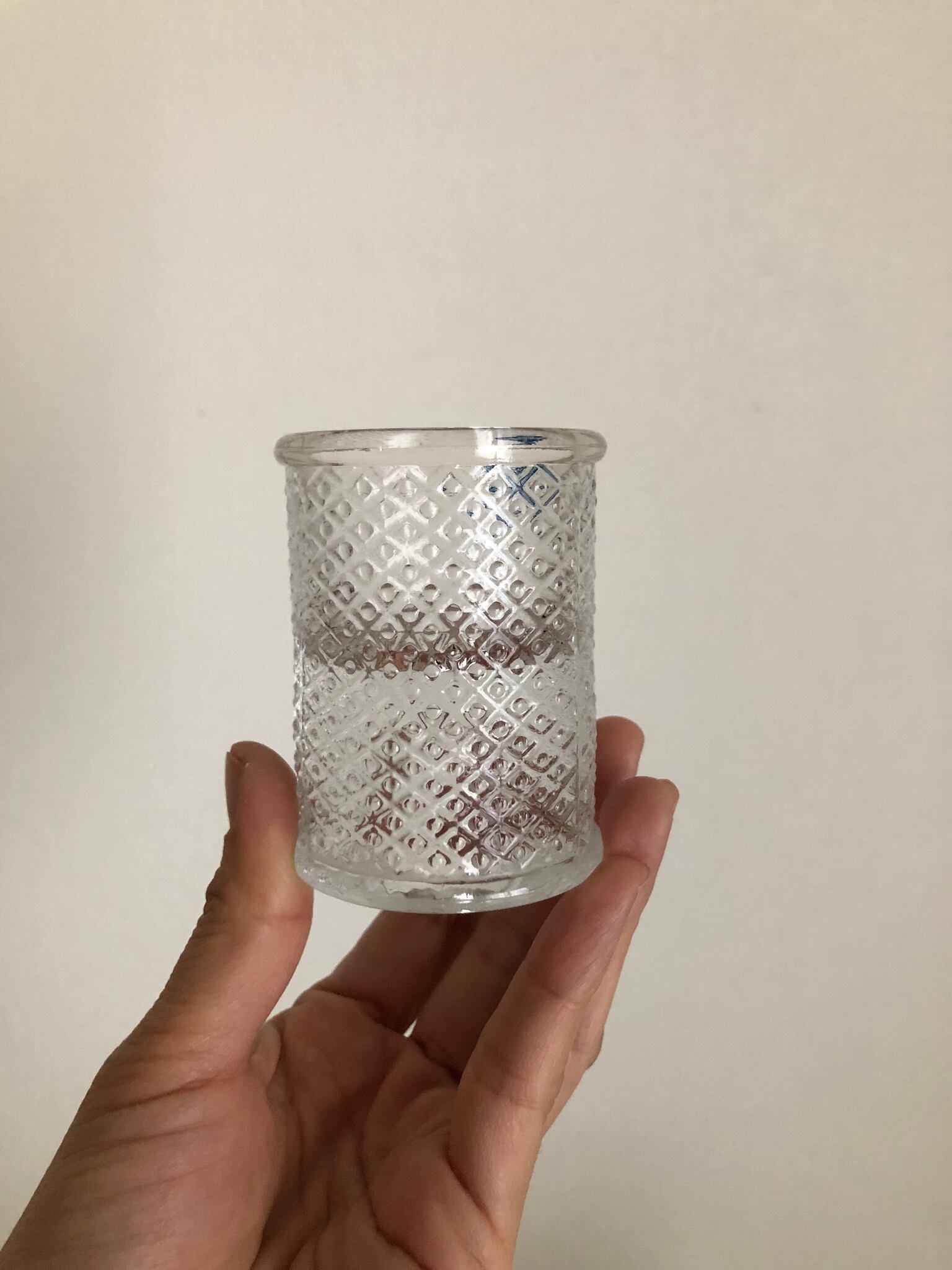 日中は自然光の下でクリアな、立体的な細かいひし形模様がキラキラと輝き、夜は部屋の明かりやキャンドルの灯りで、また違った雰囲気を楽しめます♫