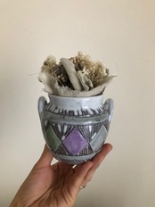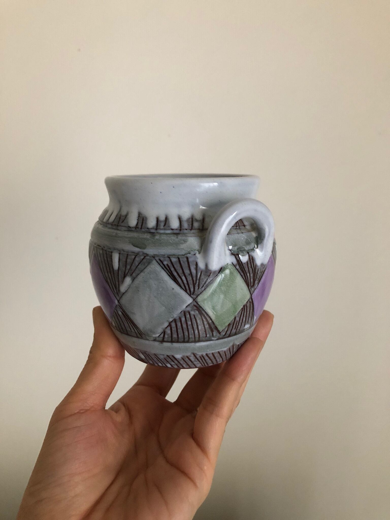 こちらは、取っ手付きのポット型が可愛らしい、フラワーベース。グレーをベースに、ラフに描かれた幾何学模様のようなダイヤの絵柄が、素敵な一品。パープルと薄いグリーンの色味が、春のインテリアにおススメなフラワーベースです♫ ドライフラワーはもちろん、フレッシュなグリーンや、開口部が広いので、ヒヤシンスなどのお花を合わせても素敵そうです♫