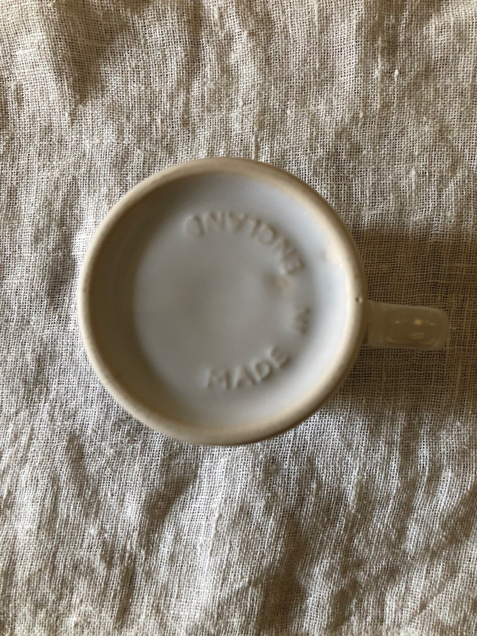 当時のマリメッコ は、陶器などの商品は、別メーカーに製造を依頼しており、こちらのウニッコのマグカップのシリーズは、イギリスのメーカーで製造されたものなので、裏に、MADE IN ENGLAND と刻印されています。