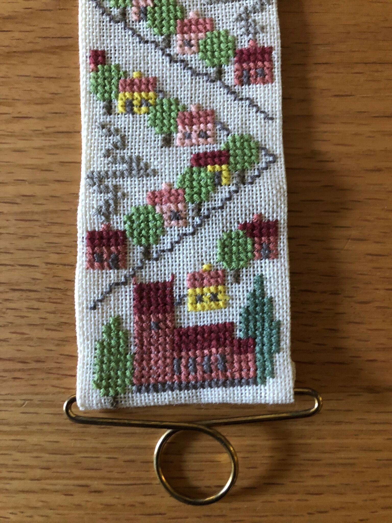 張りのあるリネン生地に、色とりどりのたくさんのおうちと木の刺繍が、とても凝っていて可愛らしいタペストリーです♫ よく見ると、いくつかのおうちの煙突から煙が♫