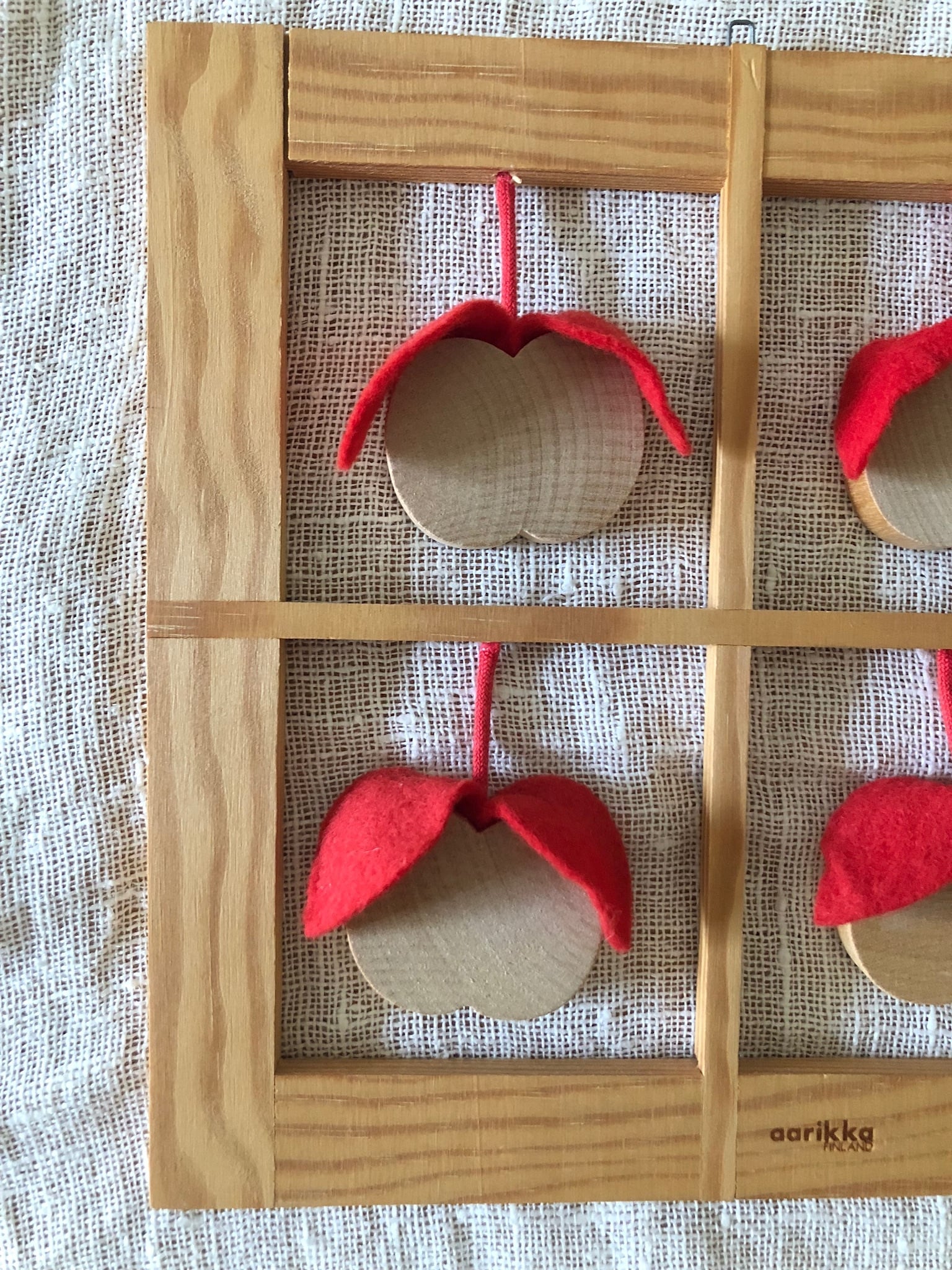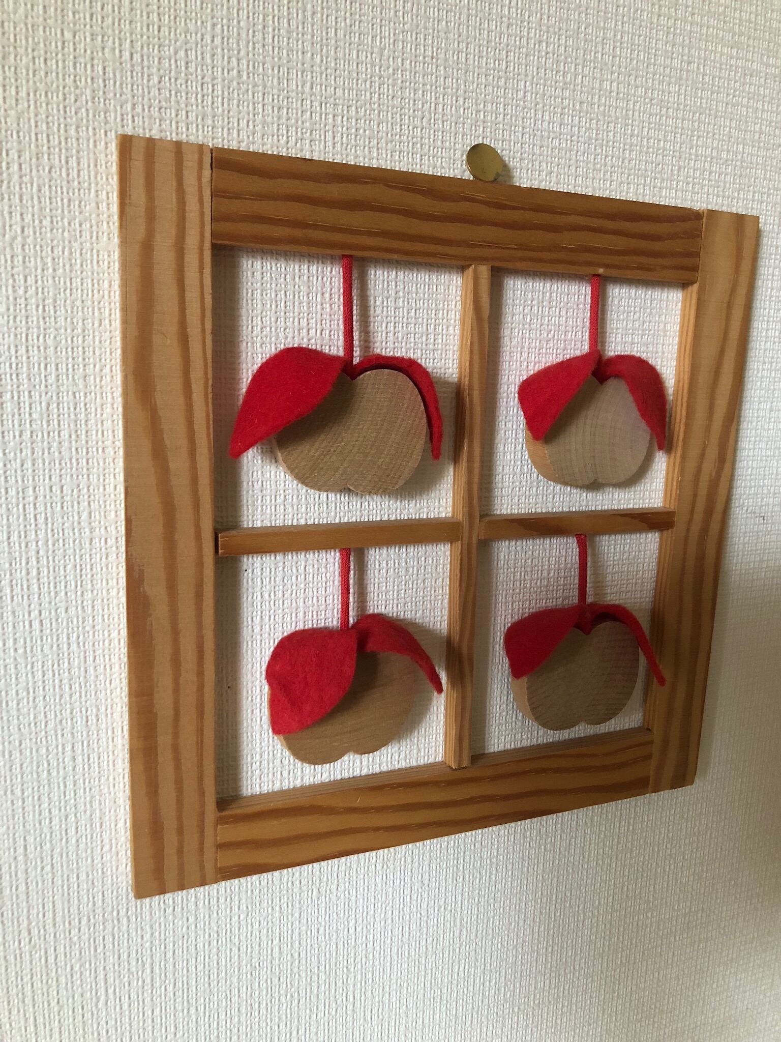 四角い木枠に、ゆらゆら揺れる4つの木のリンゴがとても可愛らしいモビールになります。
