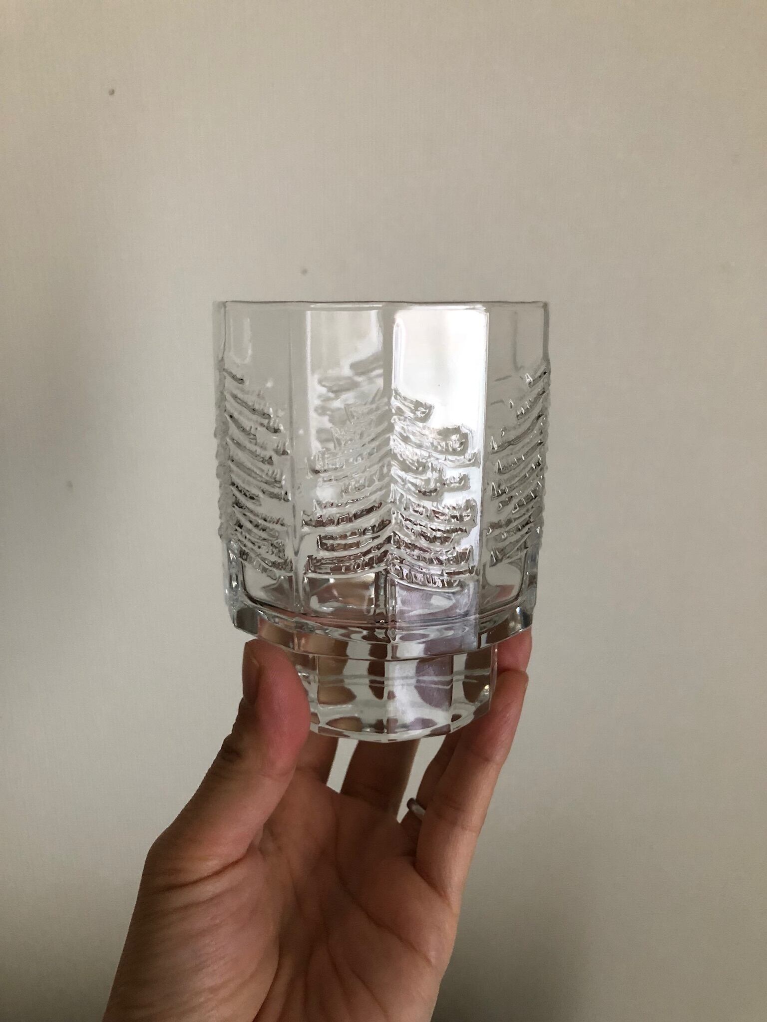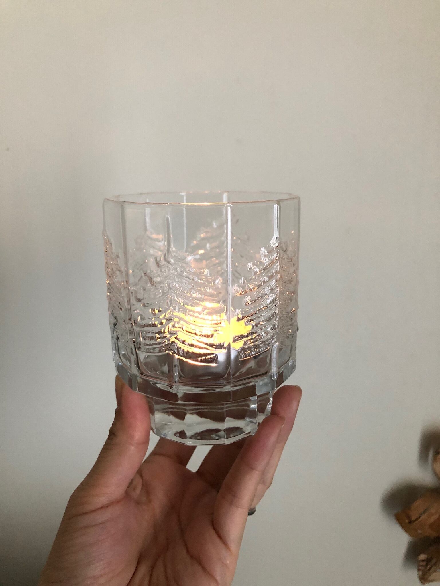 Kuusi シリーズは大きさ、フォルム、ガラスの厚さなどがいくつか種類がありますが、こちらは、金具ホルダーと紐付きの吊るせるランタンタイプの珍しいタイプになります。吊るすタイプで作られている為、上部のガラスが少し薄いぶん、モミの木の柄がより一層際立って見えます♫