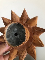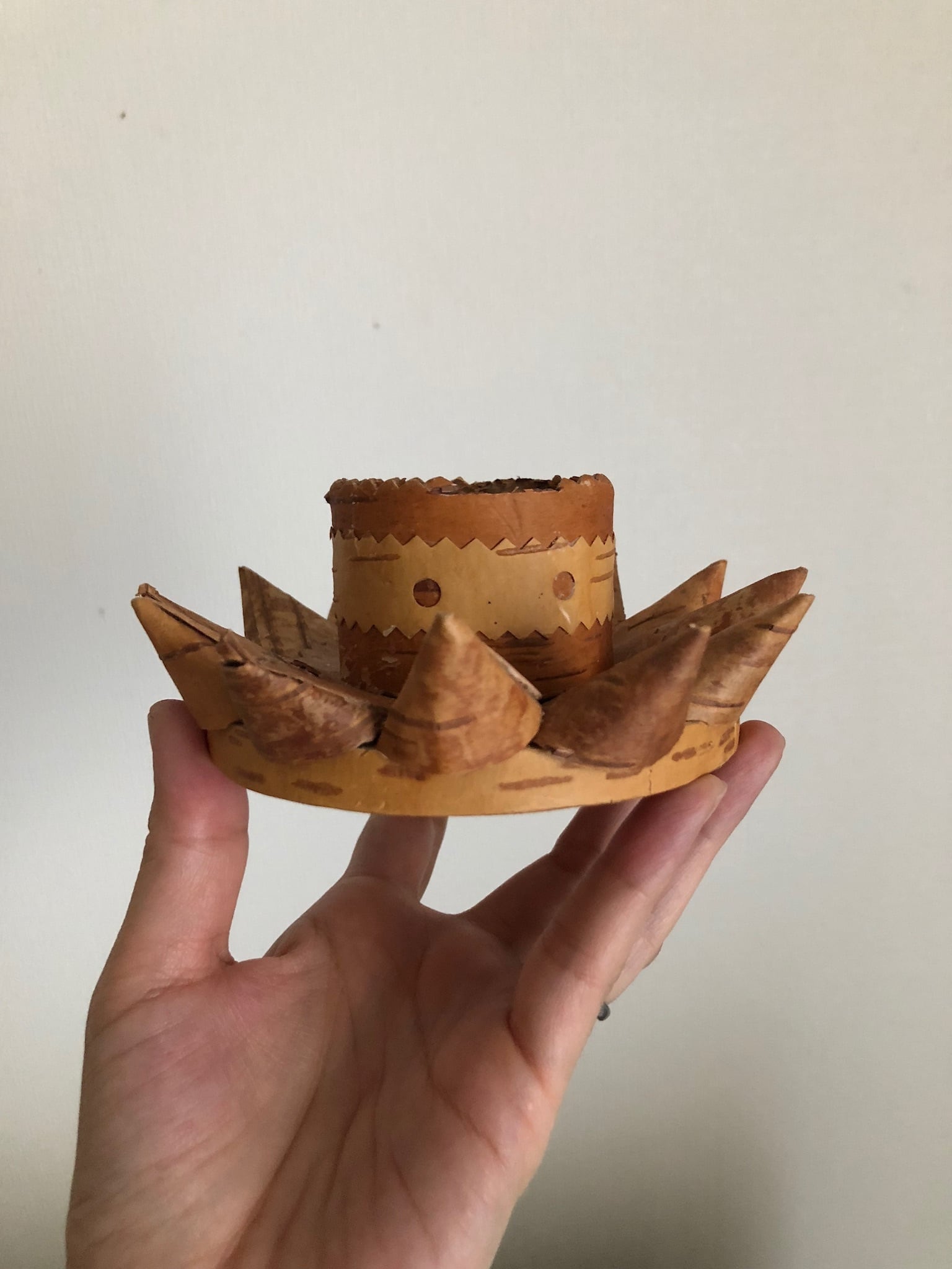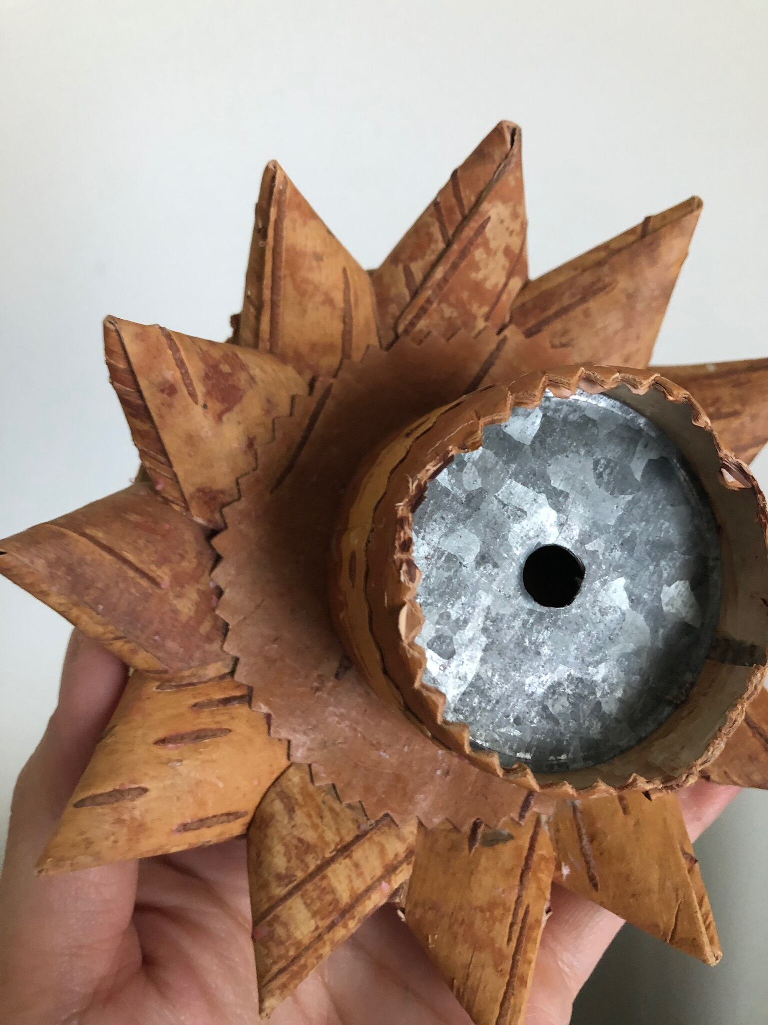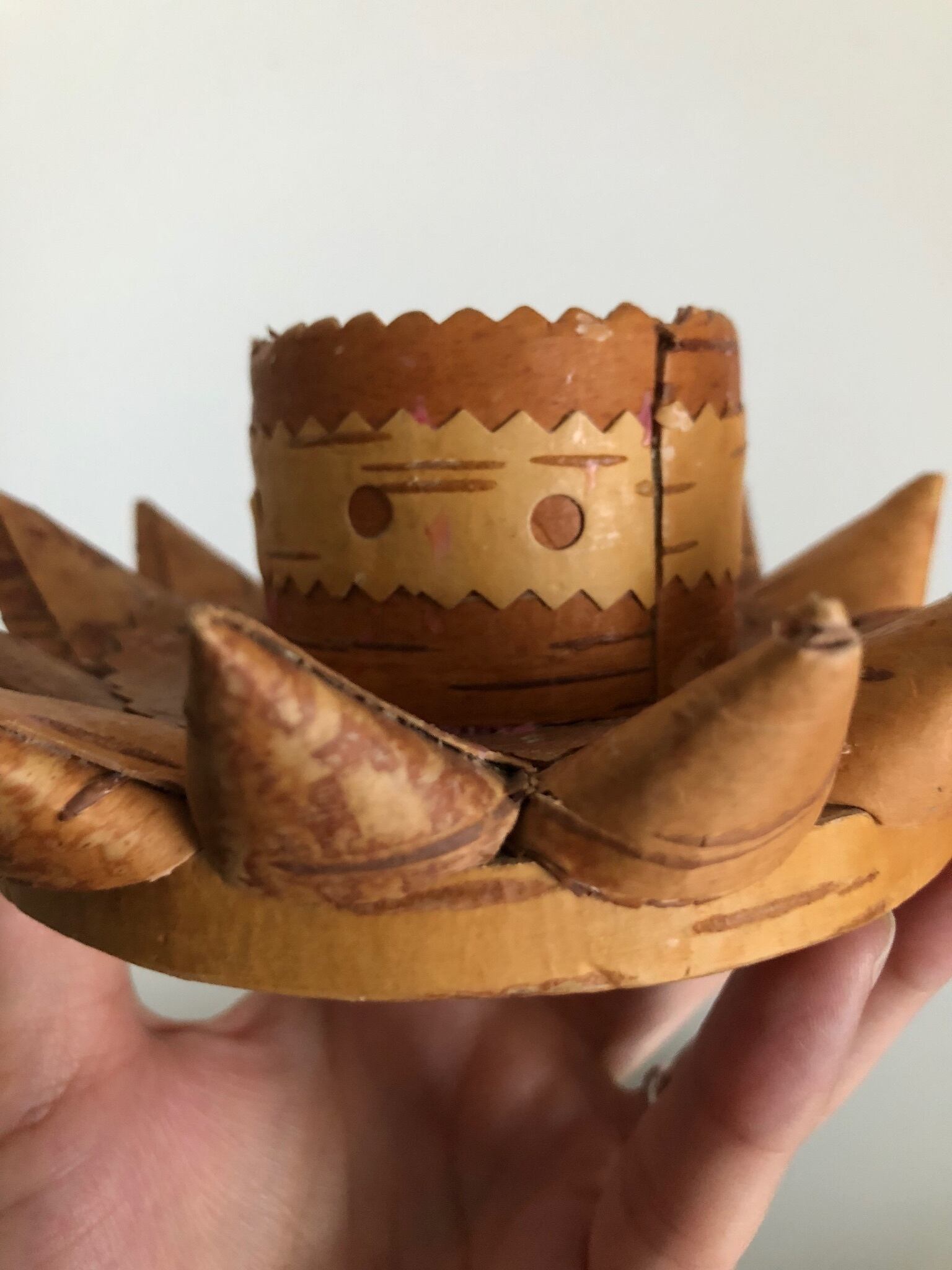 ところどころ白樺の薄皮がはがれている箇所がございます。上部のギザギザの部分が折れて切れてる箇所があり、ロウが少し残ってる箇所がございます。その為、サイズが大きめで凝ったデザインですが、お値段少しお安くさせて頂いております。写真でよくご確認下さい。