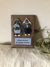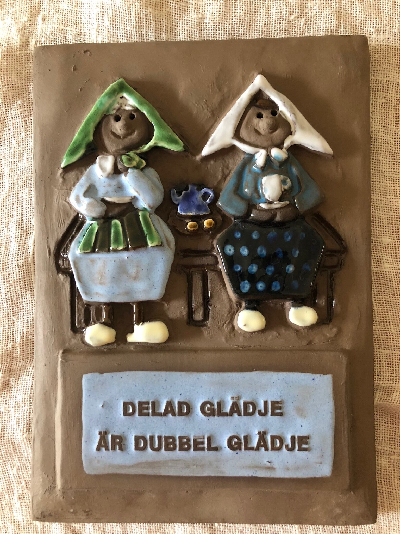 こちらは、スウェーデンの諺、「喜びをを分かち合えば喜びも2倍に」 と書いてあり、その諺の通り、テーブルを挟んで楽しそうにお茶を飲んでいる2人の女性の素朴な絵柄がとても可愛いらしい一枚♫