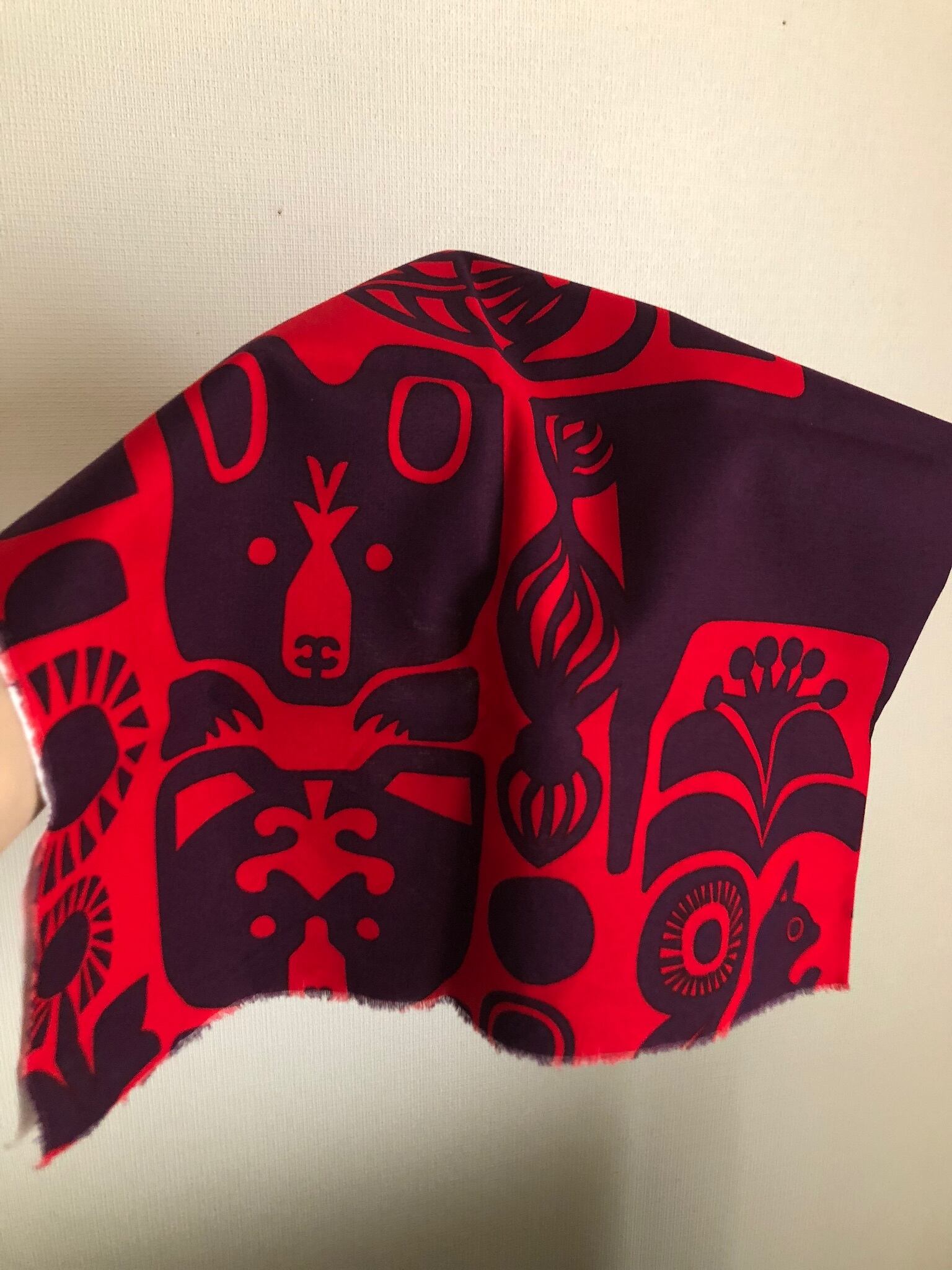 赤色をベースに、キツネ、馬、クマ、トナカイ、鳥、リス、お花などが、幾何学模様のように描かれており、個性的で可愛いらしい生地です♫
