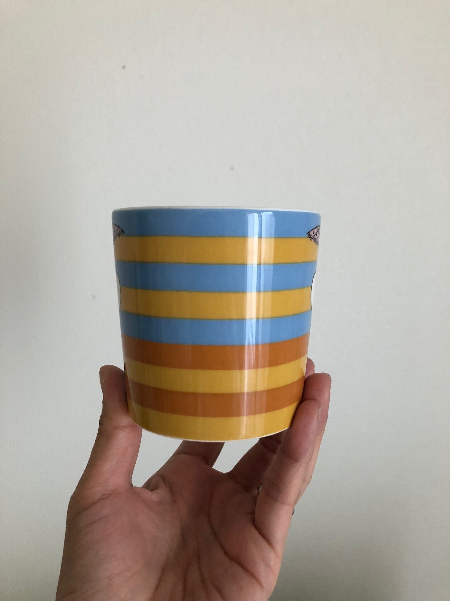 水色、オレンジのボーダー柄も夏らしく、持ち手越しに描かれた大きな太陽が灼熱の海辺を思わせます♫どの角度から見ても可愛いらしいマグカップです。2008年の夏期限定で、レアな一品です♫