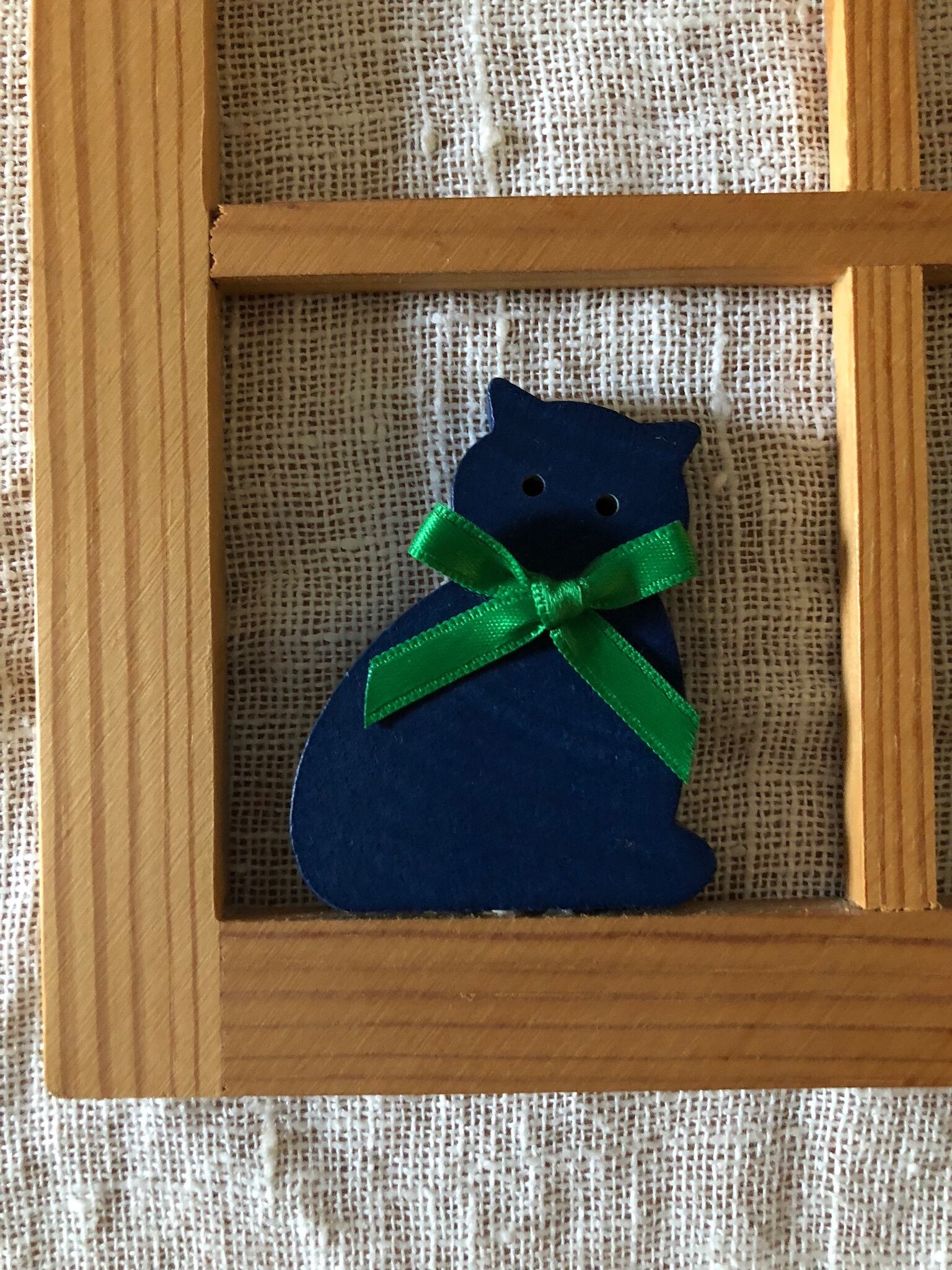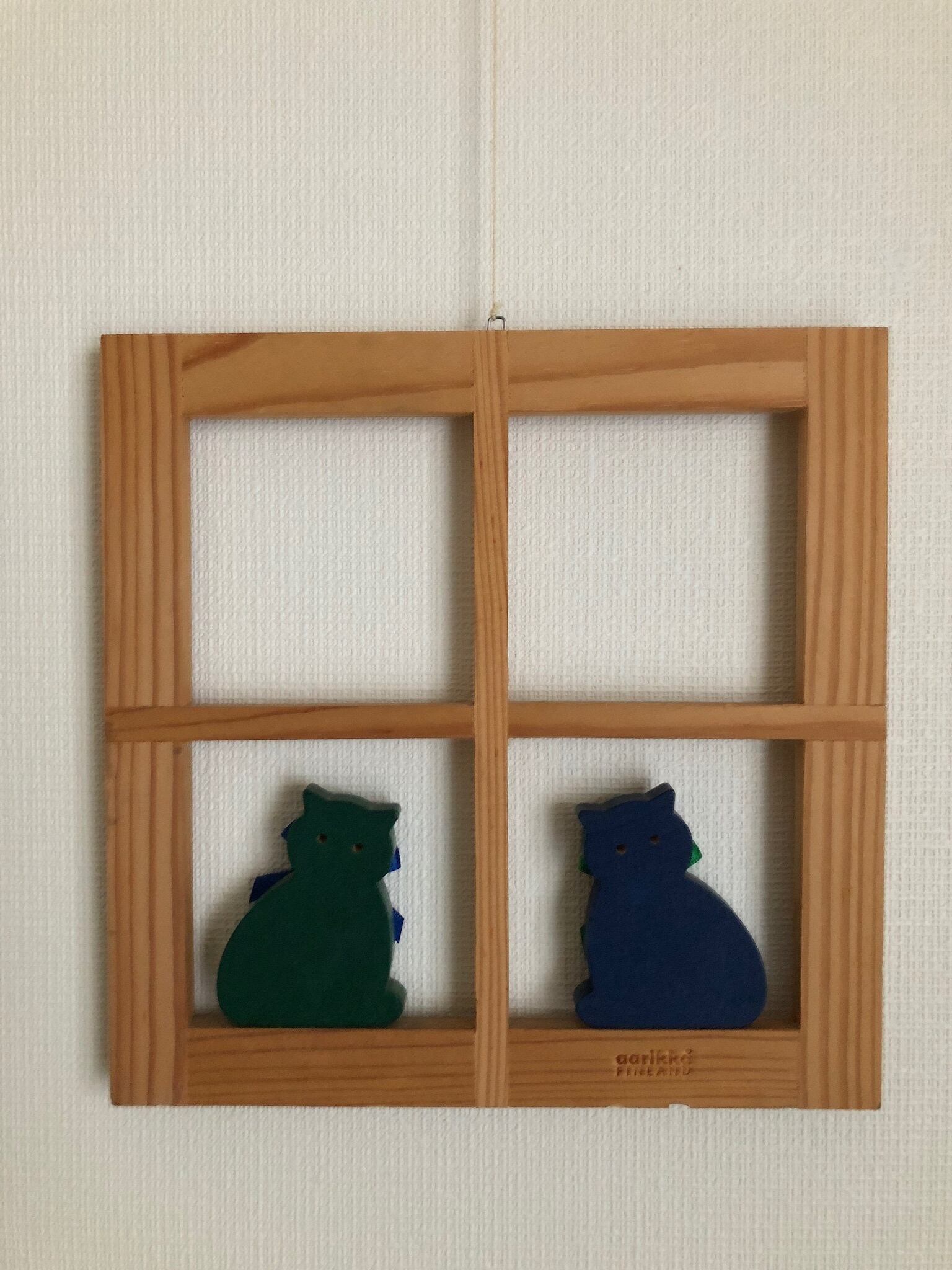 四角い木枠に、グリーンと青のネコのモチーフが可愛らしいモビールになります♫ リボンがまたアクセントになっていて可愛いです。