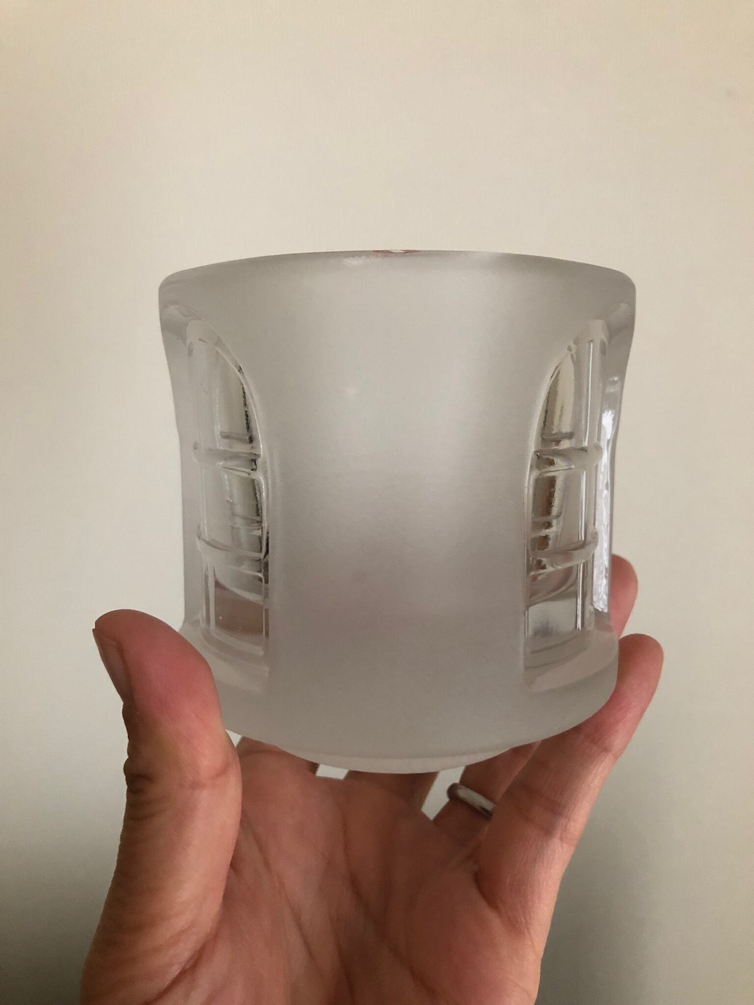 特に目立った汚れやダメージはありませんが、フロストガラスの特性上、曇りにムラがある箇所がございます。内側の底に小さな気泡が見られます。表のフロストガラス部分に、自然光の下にかざすと、ごくわずかにテープ跡が見られます(写真14枚目参照)。赤いホルダーのてっぺんの部分の内側が少し黒くなっているのと、底の内側が白くなってる箇所がございます。