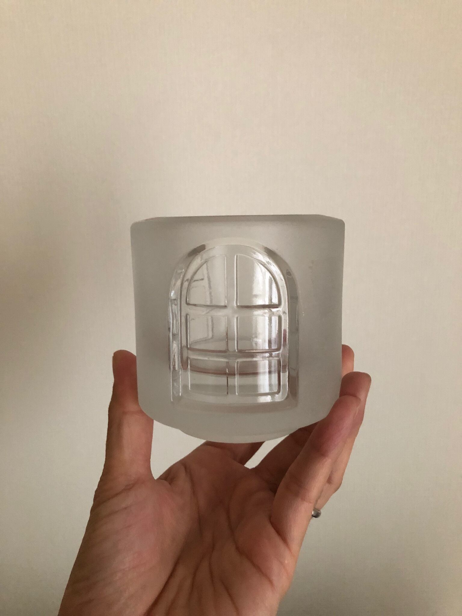 フロストガラスと、窓のクリアガラスの組み合わせが素敵なキャンドルホルダーです。