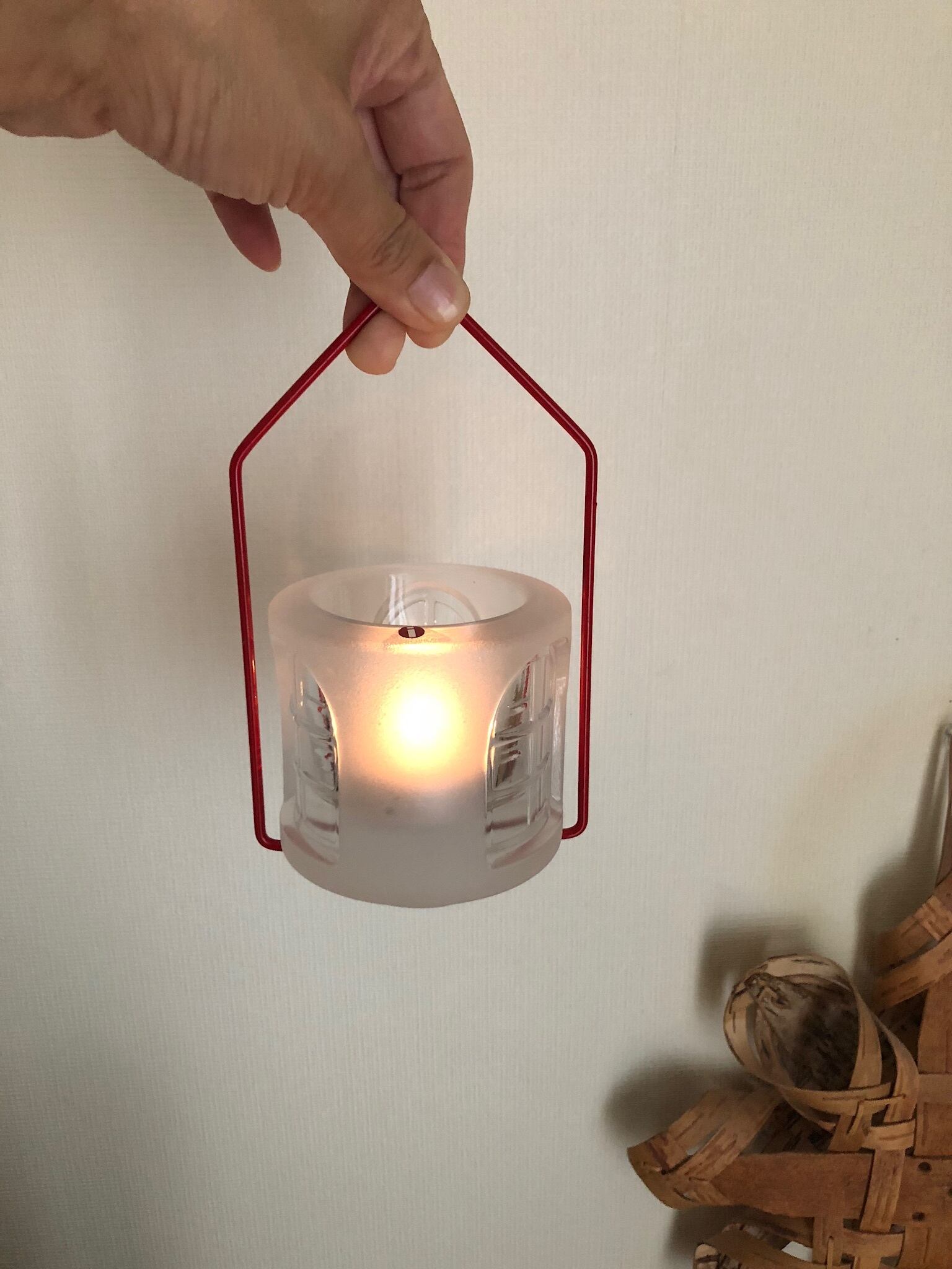 Balladiシリーズは大きさ、フォルム、ガラスの厚さなどがいくつか種類がありますが、こちらはガラスが厚いタイプの、ずっしりと重みがあるLサイズで、赤のホルダー付きの吊るせるランタンタイプのキャンドルホルダーになります。