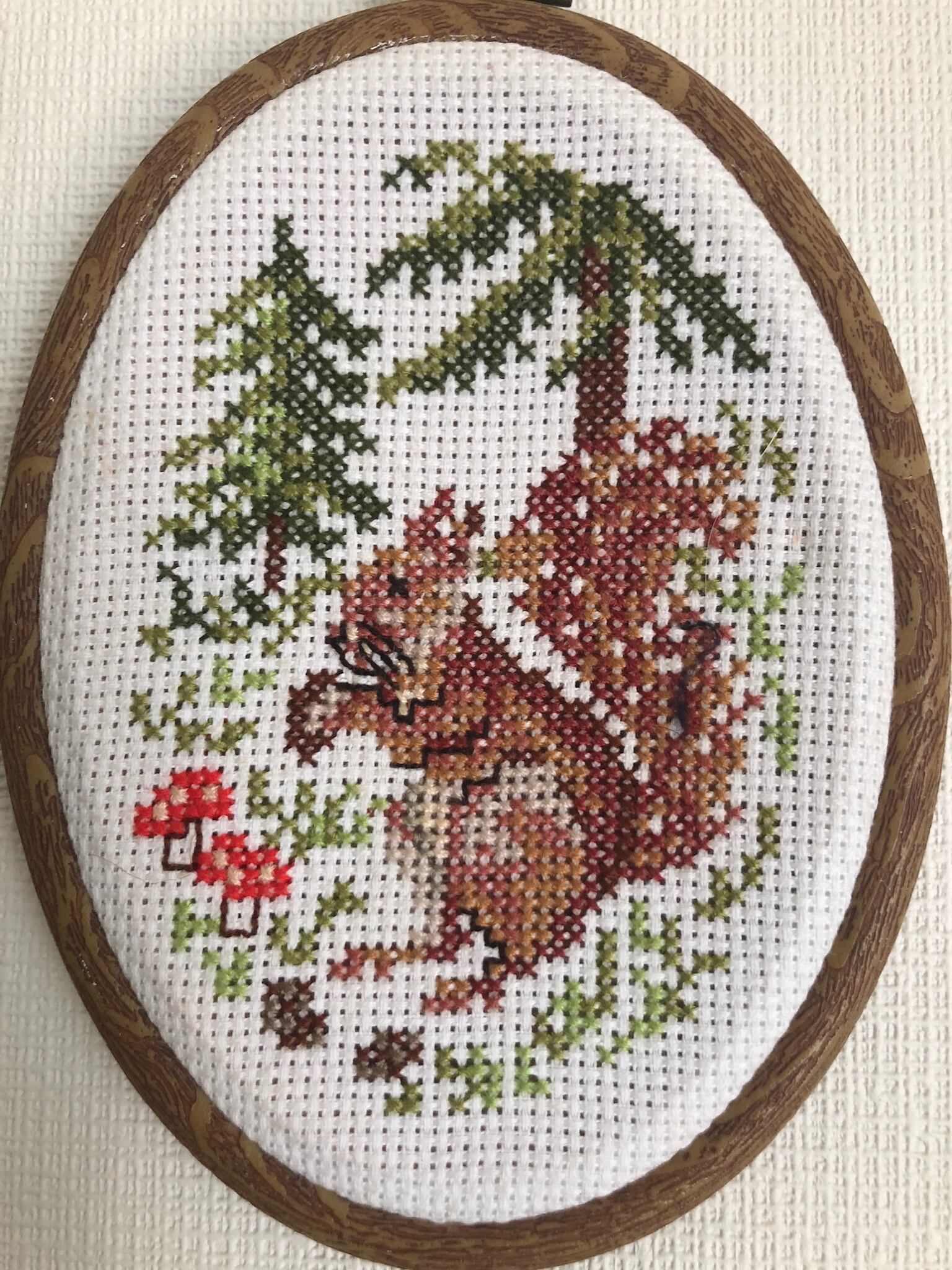 リスの絵柄が可愛いらしいクロスステッチの刺繍飾り。