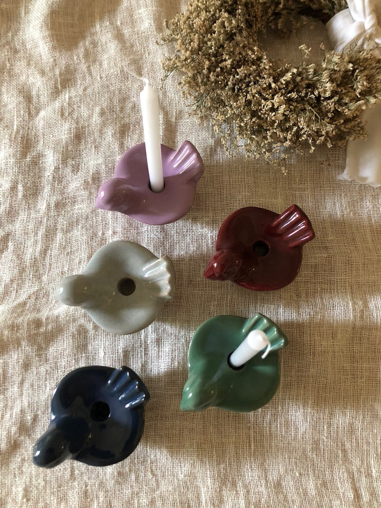 スモーキーなグリーンの鳥が可愛いらしい陶器のキャンドルスタンドです。