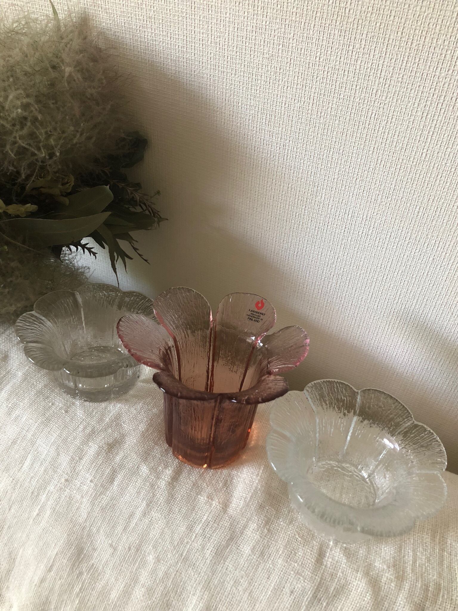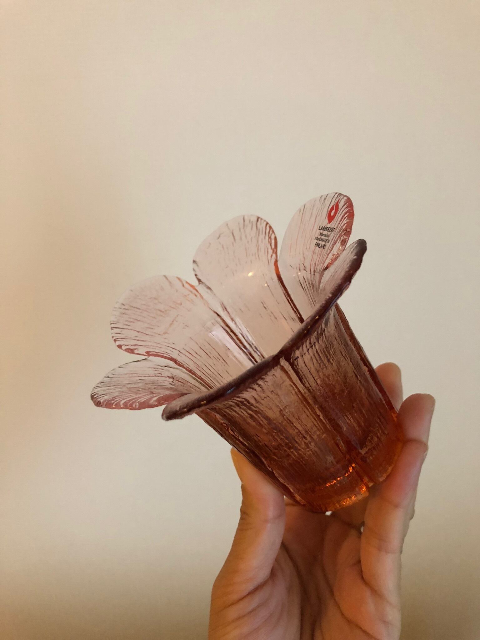 Teralehtiシリーズのガラスのキャンドルホルダーです。Teralehtiとは花びらの意味。その名の通り、お花がパッと開いたようなデザインとローズピンクの色が可愛らしいタイプ。