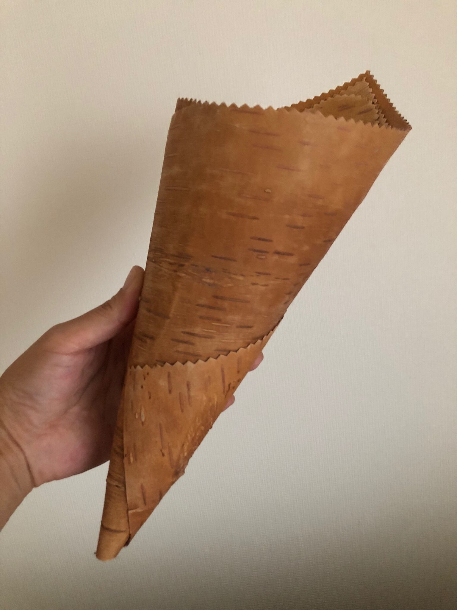 白樺の1枚樹皮をコーン型に巻いた、シンプルな壁掛けになります。