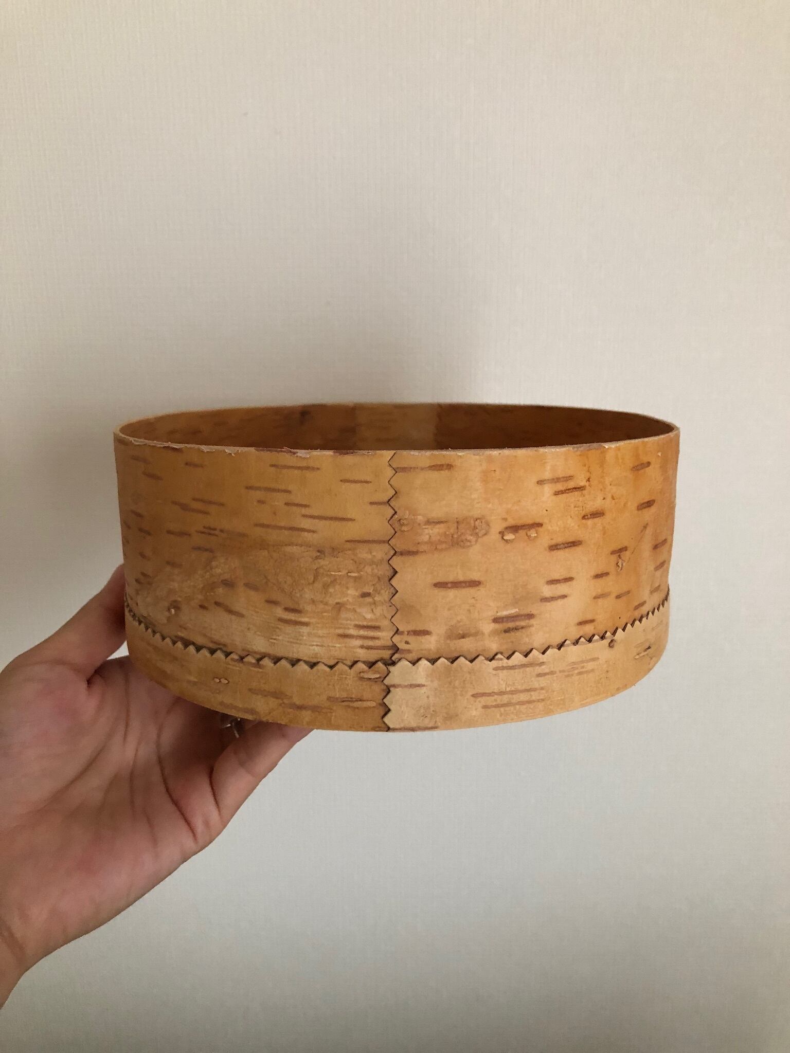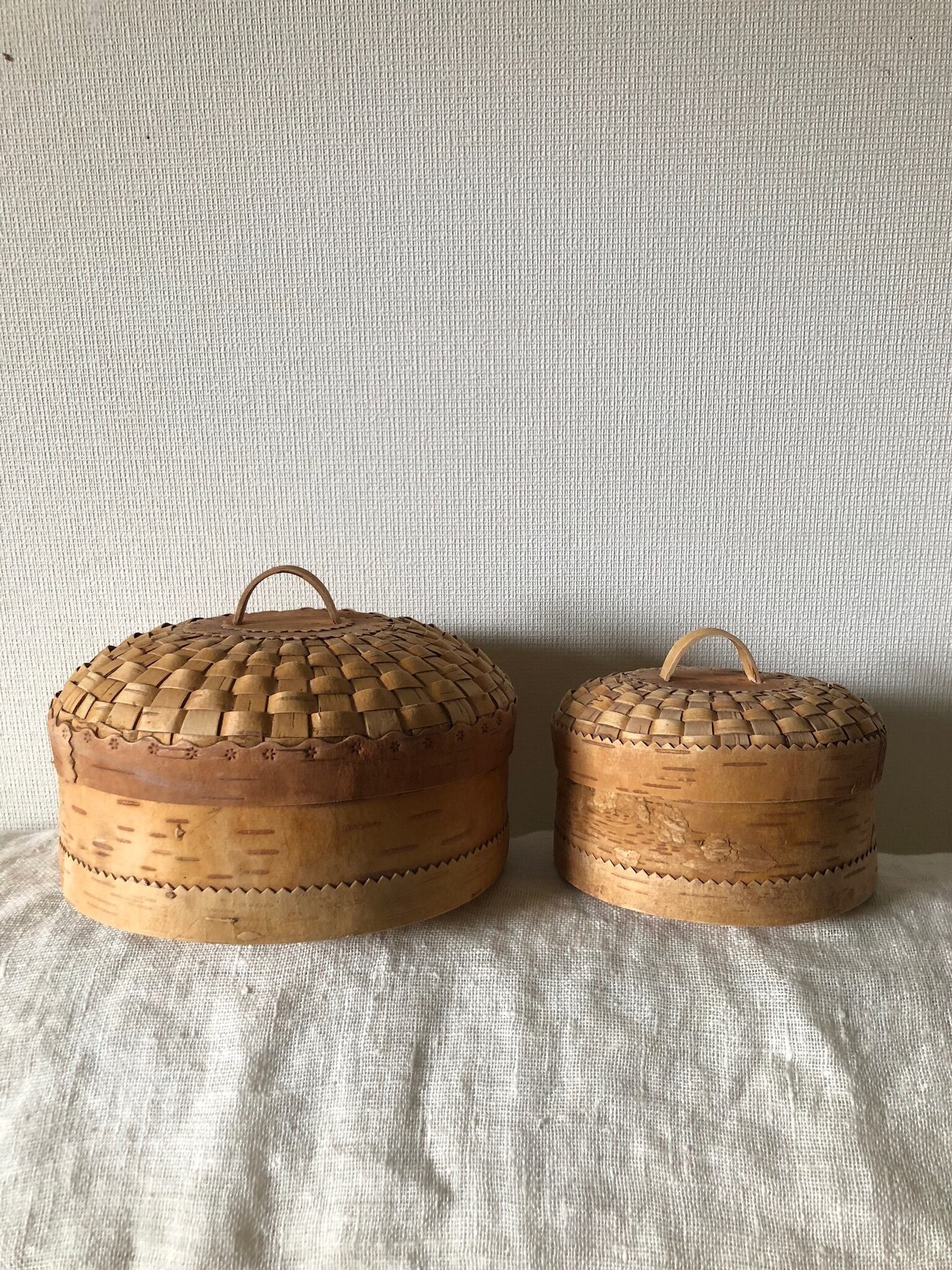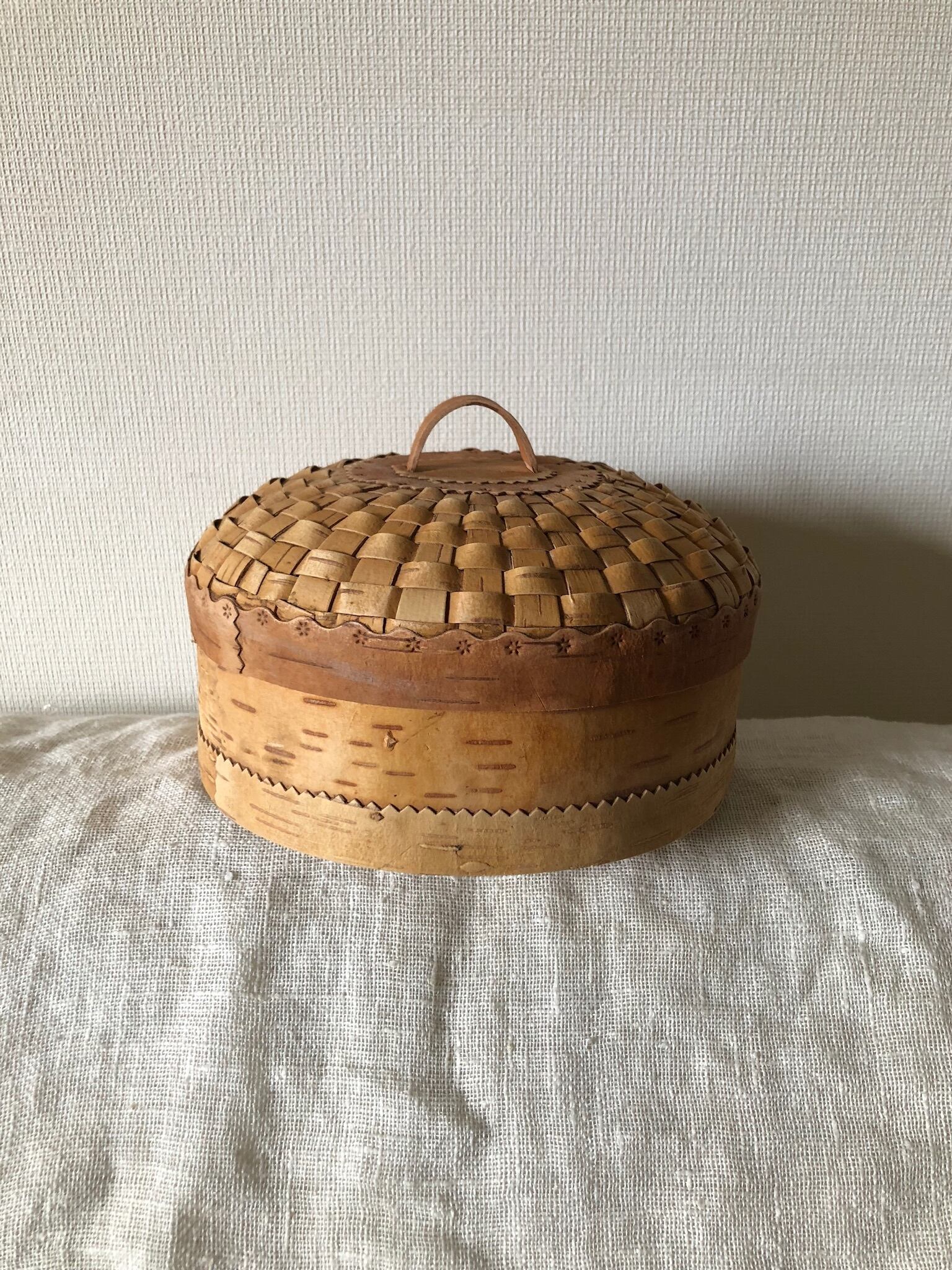 丸いこんもりした形と、蓋の細かい白樺編みが、とても凝っていて可愛らしいキャニスター。さりげない小花の型押しもポイント♫