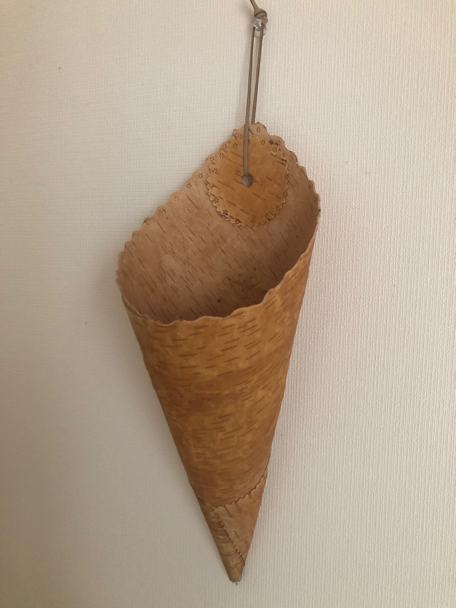 白樺の1枚樹皮をコーン型に巻いた、シンプルな壁掛けになります。