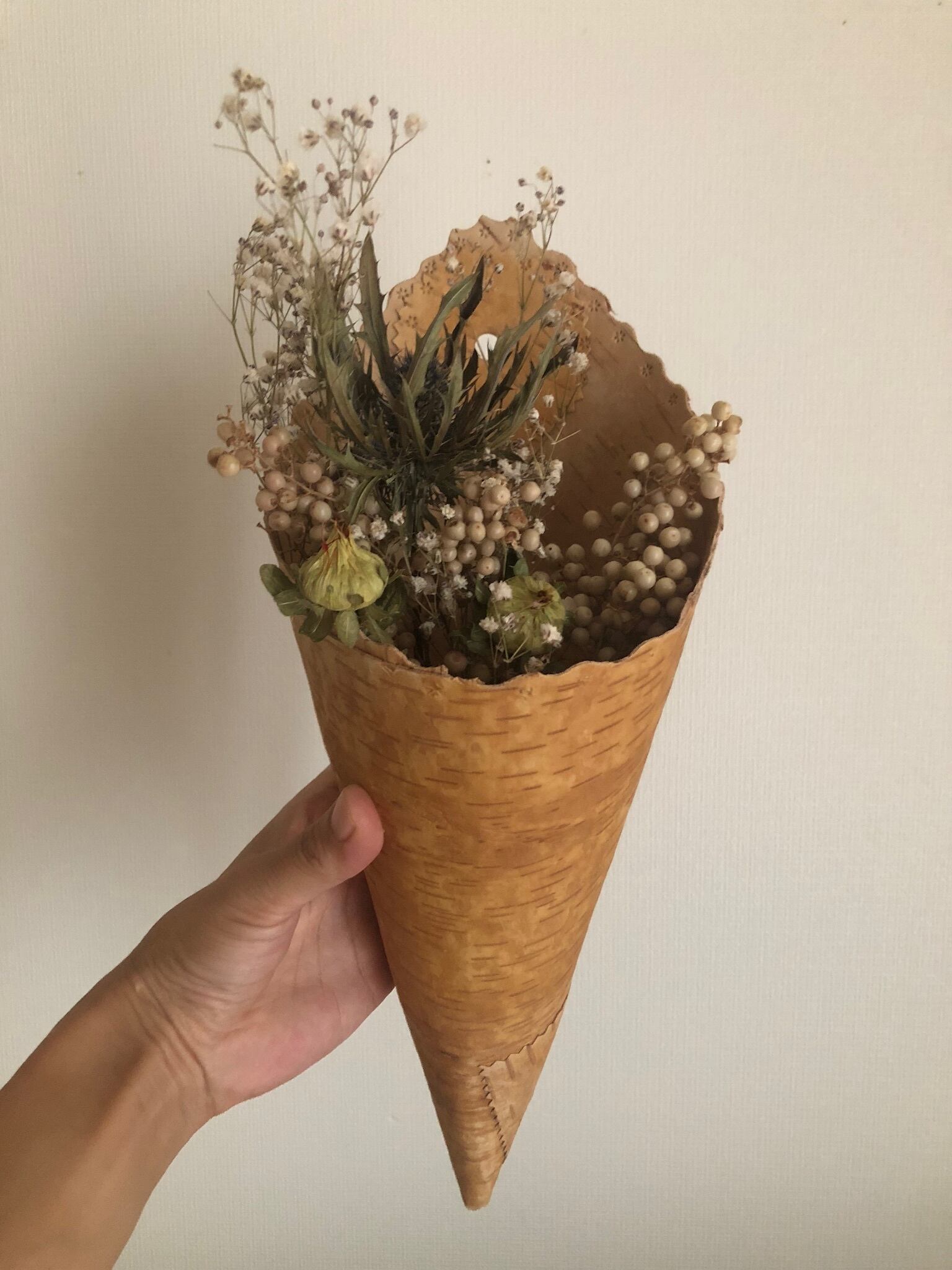 ドライフラワーやブーケを入れたり、白樺のお花とも相性抜群です。そのまま壁にかけて飾っても、素敵です♫