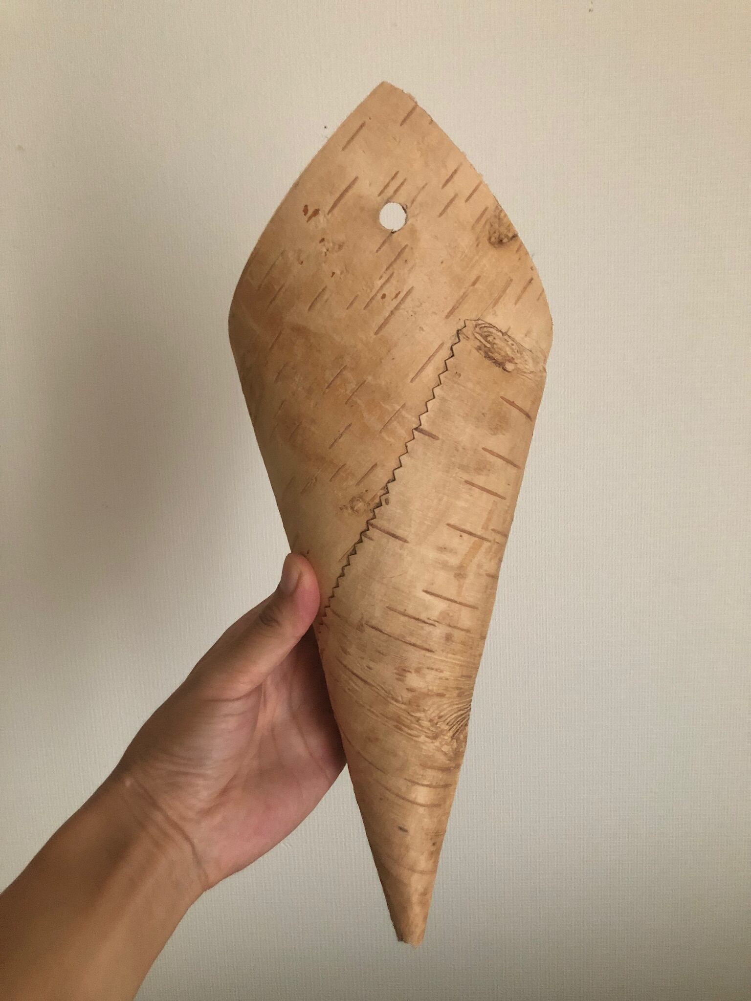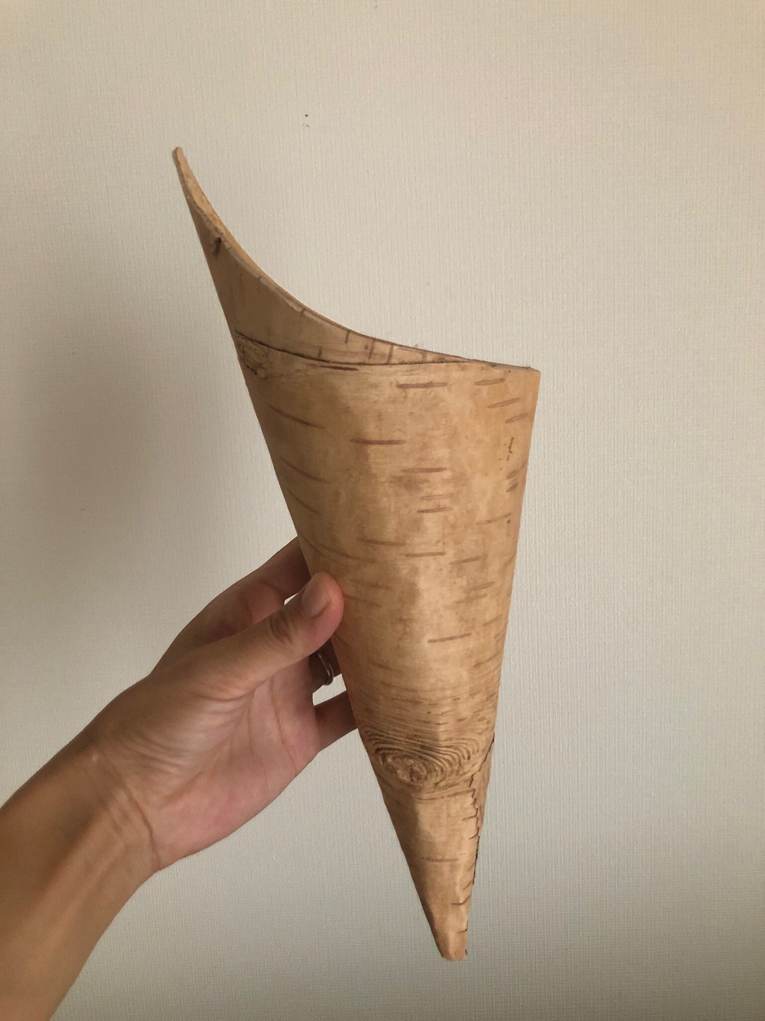白樺の1枚樹皮をコーン型に巻いた、シンプルな壁掛けになります。