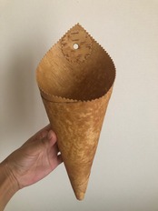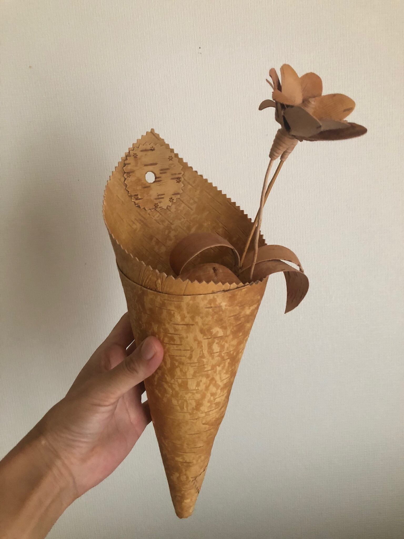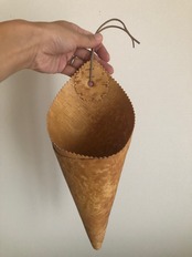 白樺の1枚樹皮をコーン型に巻いた、シンプルな壁掛けになります。