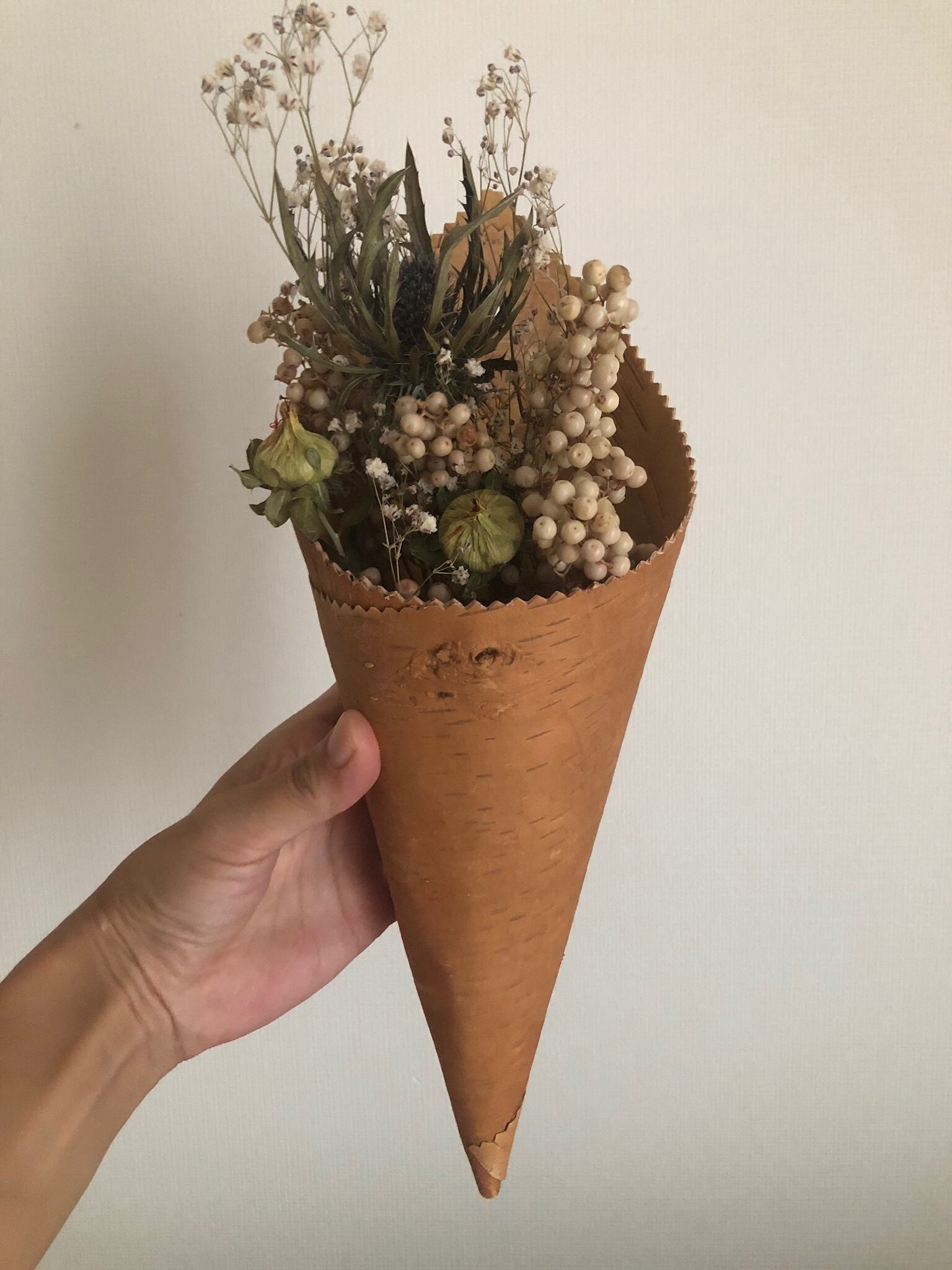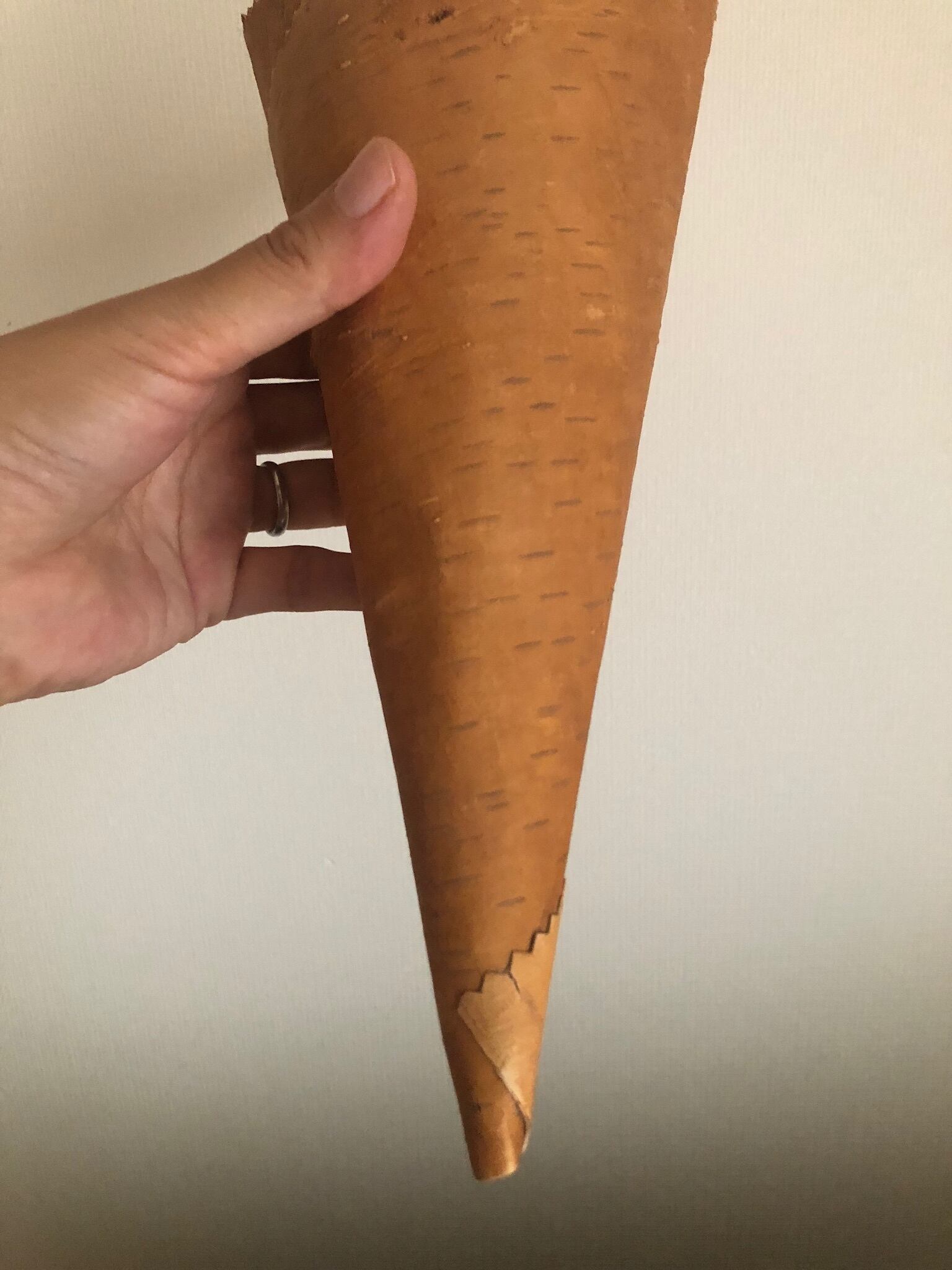 白樺の1枚樹皮をコーン型に巻いた、シンプルな壁掛けになります。