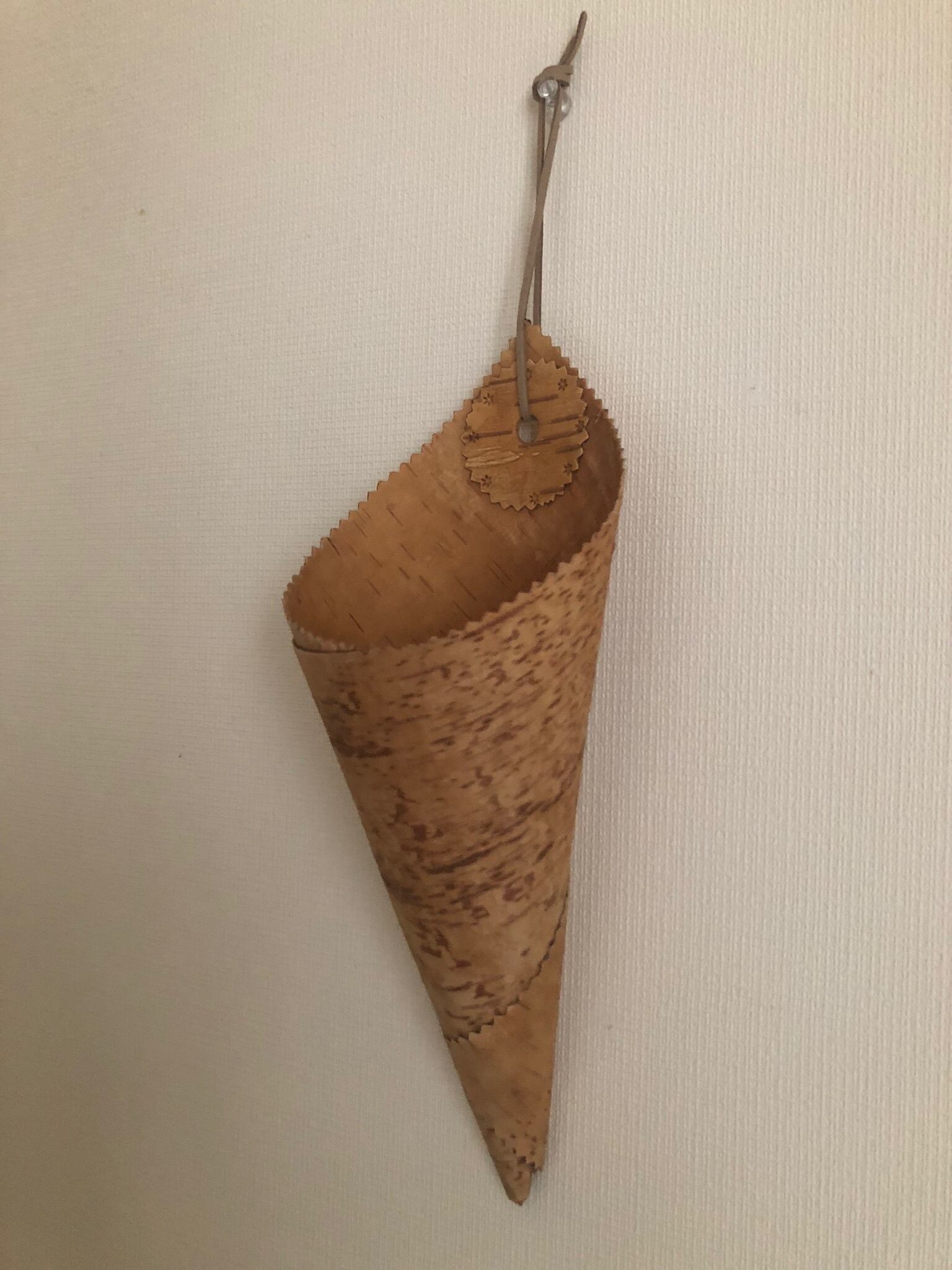 白樺の1枚樹皮をコーン型に巻いた、シンプルな壁掛けになります。