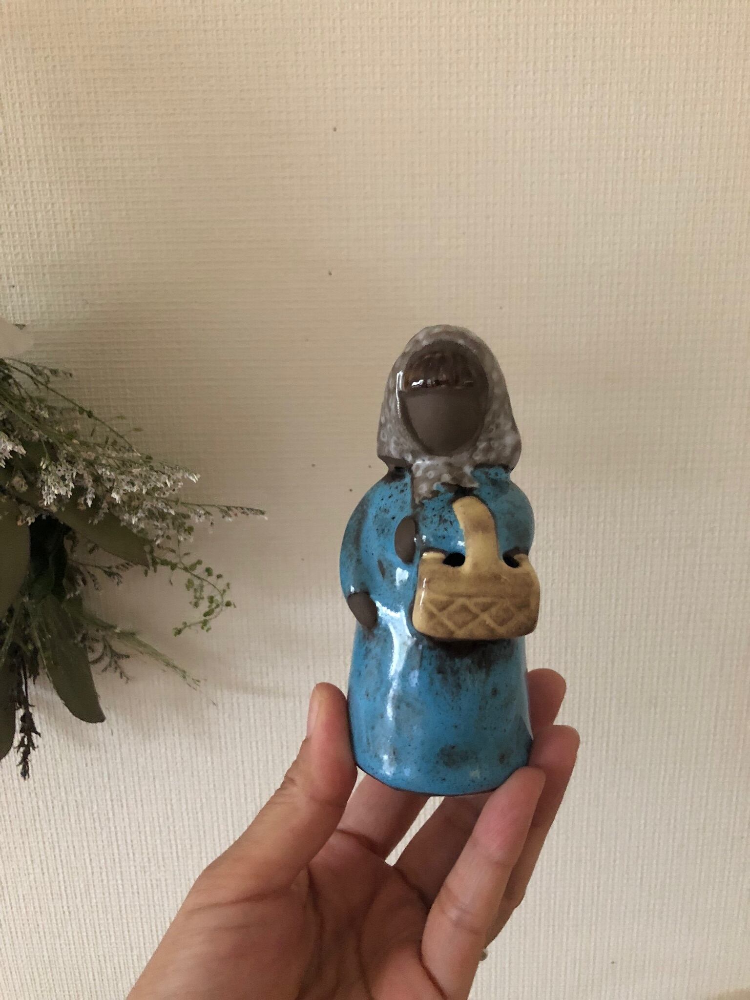艶やかなブルーの洋服とグレーホワイトのスカーフ、顔と手の素焼きの組み合わせが素朴で可愛らしい一品。jieのフラワーガールの中でも、珍しいデザインの女の子です。