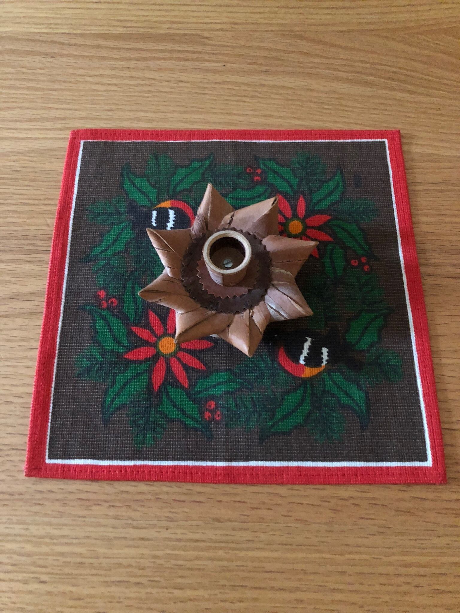 キャンドルホルダーやフラワーベースの下にさらっと敷いたり、棚やテーブルの上にさりげなく敷いたり、使いやすい大きさです♬ 特に目立った汚れもなく状態は良好です。