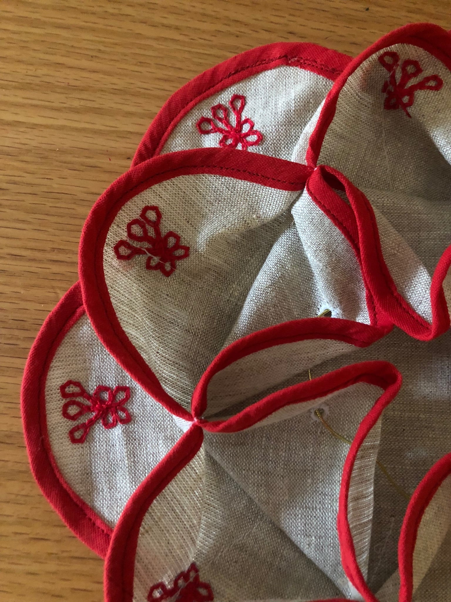 生成りのリネン生地に、赤いお花刺繍が、素朴で可愛いらしいお菓子入れ♫ まるで花びらがたくさん集まったお花のよう。