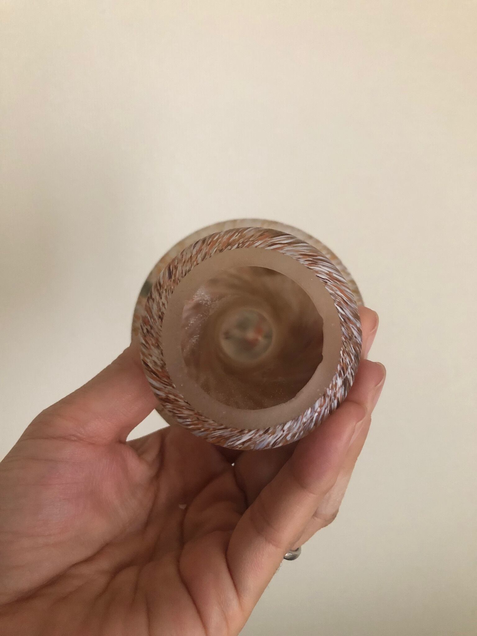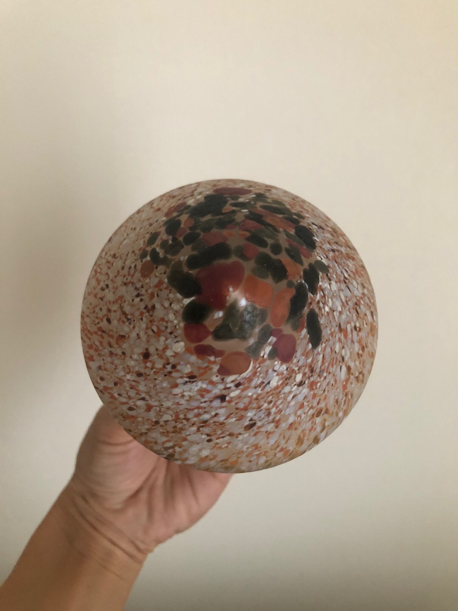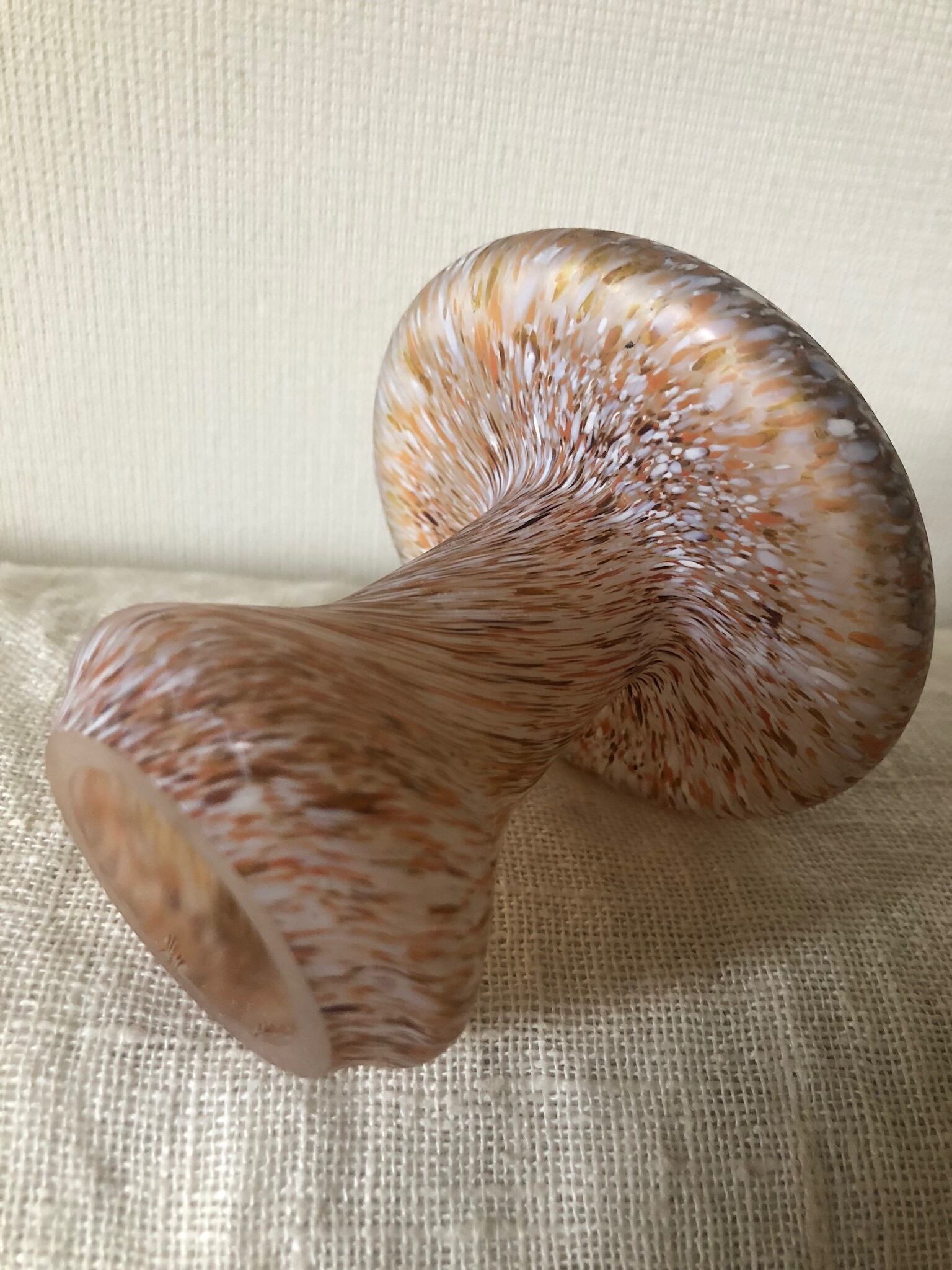 ブラウンのグラデーションのマーブル模様をベースに、トップのカサの部分に、少し大きめのマーブル模様が散りばめられた、ぽってりしたフォルムと、マットな質感が可愛いらしい、素敵なハンドメイドのガラスのオブジェです。