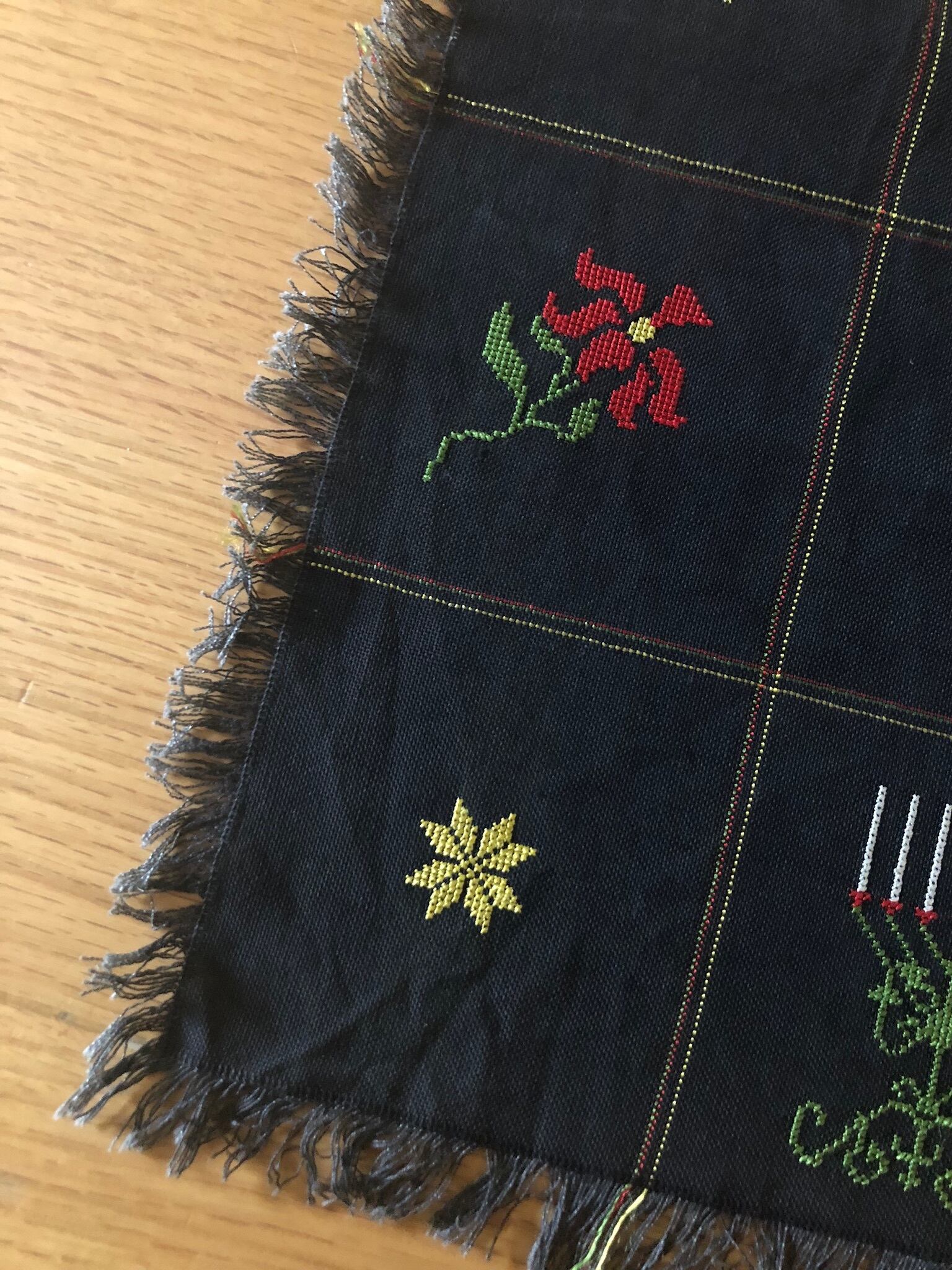 薄手のブラックの生地に、燭台とロウソク、ポインセチア、星の刺繍がされた、シックで素敵なクリスマスのクロス。回りのフリンジがまたポイント♫