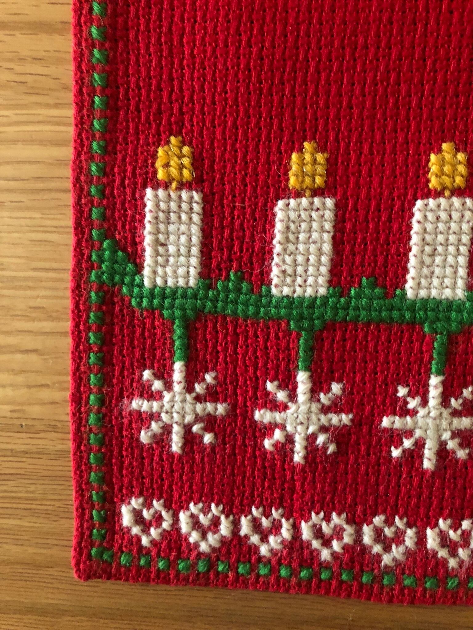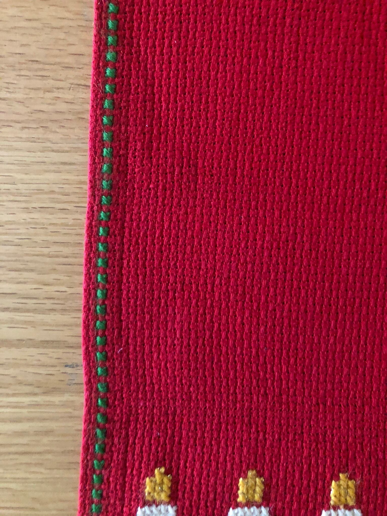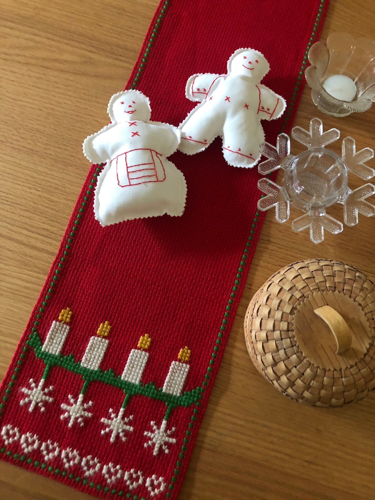 少し厚手のしっかりした赤い生地に、シンプルなキャンドルとハートの刺繍が素朴で可愛いらしいクリスマスのクロスです♫