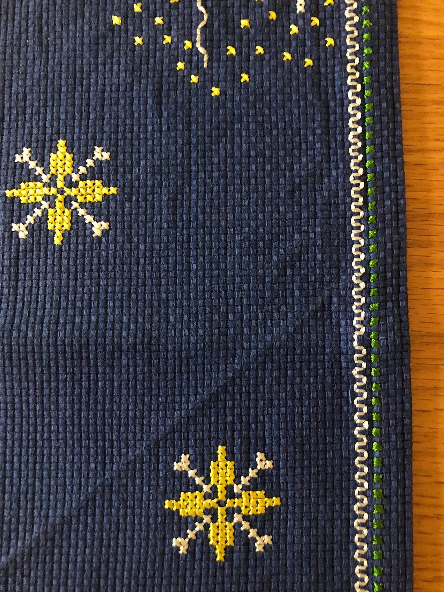 ブルーの生地に、仲良く手をつないだ男の子、女の子のトムテと、おうちとツリーの雪景色の刺繍が可愛らしいクリスマスのクロス。1人のトムテの手には、パッと光るキャンドルの刺繍がしてあり、とても凝っています♫