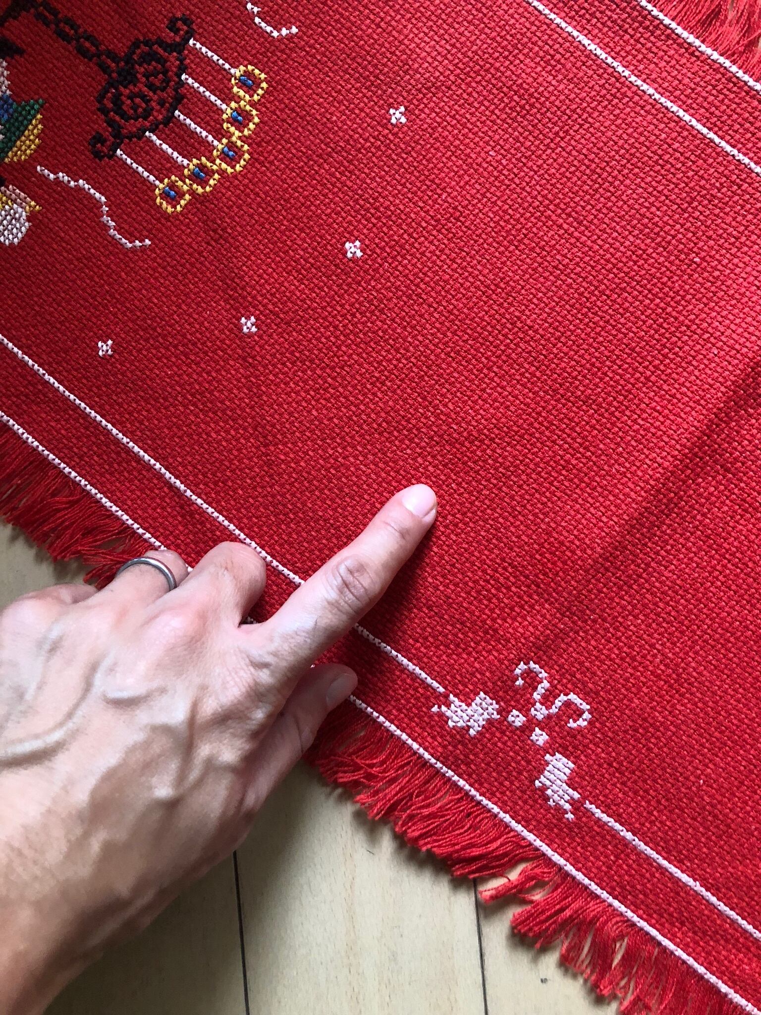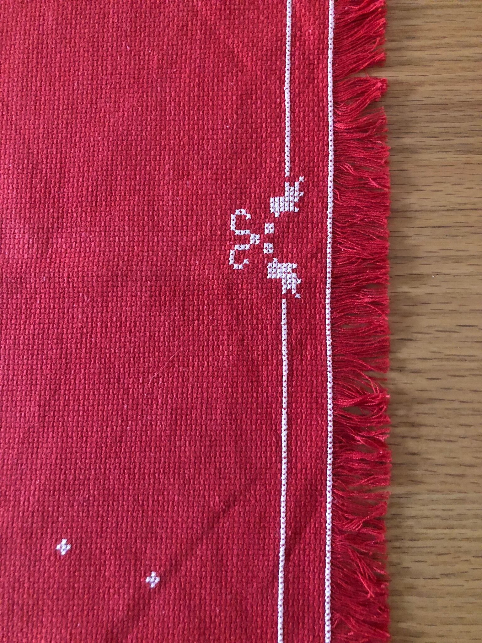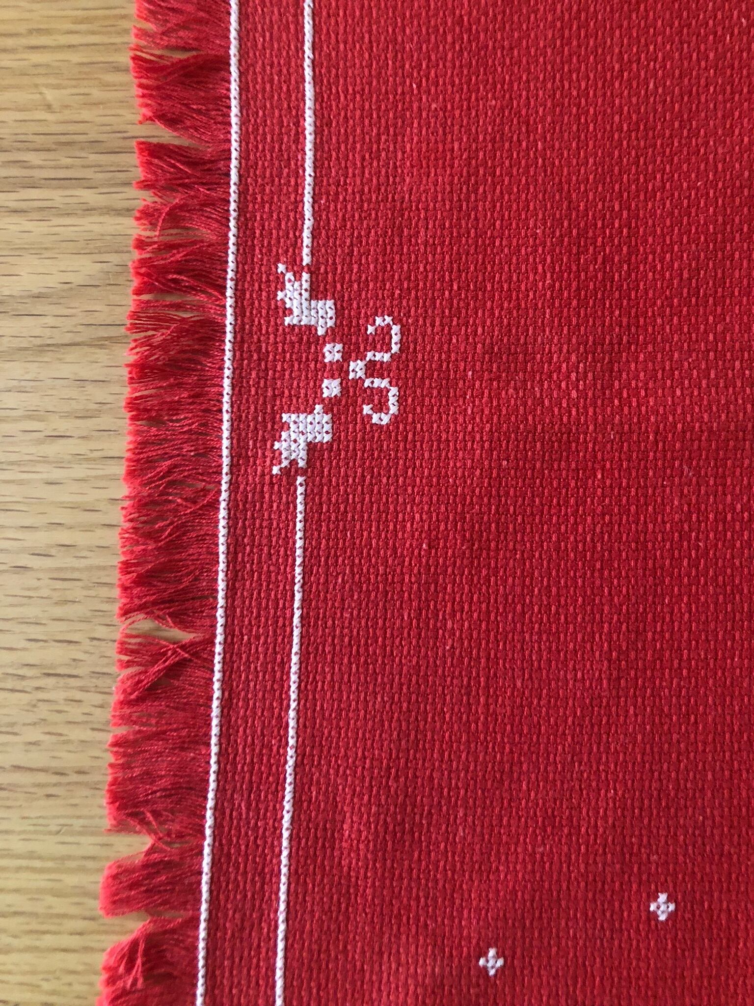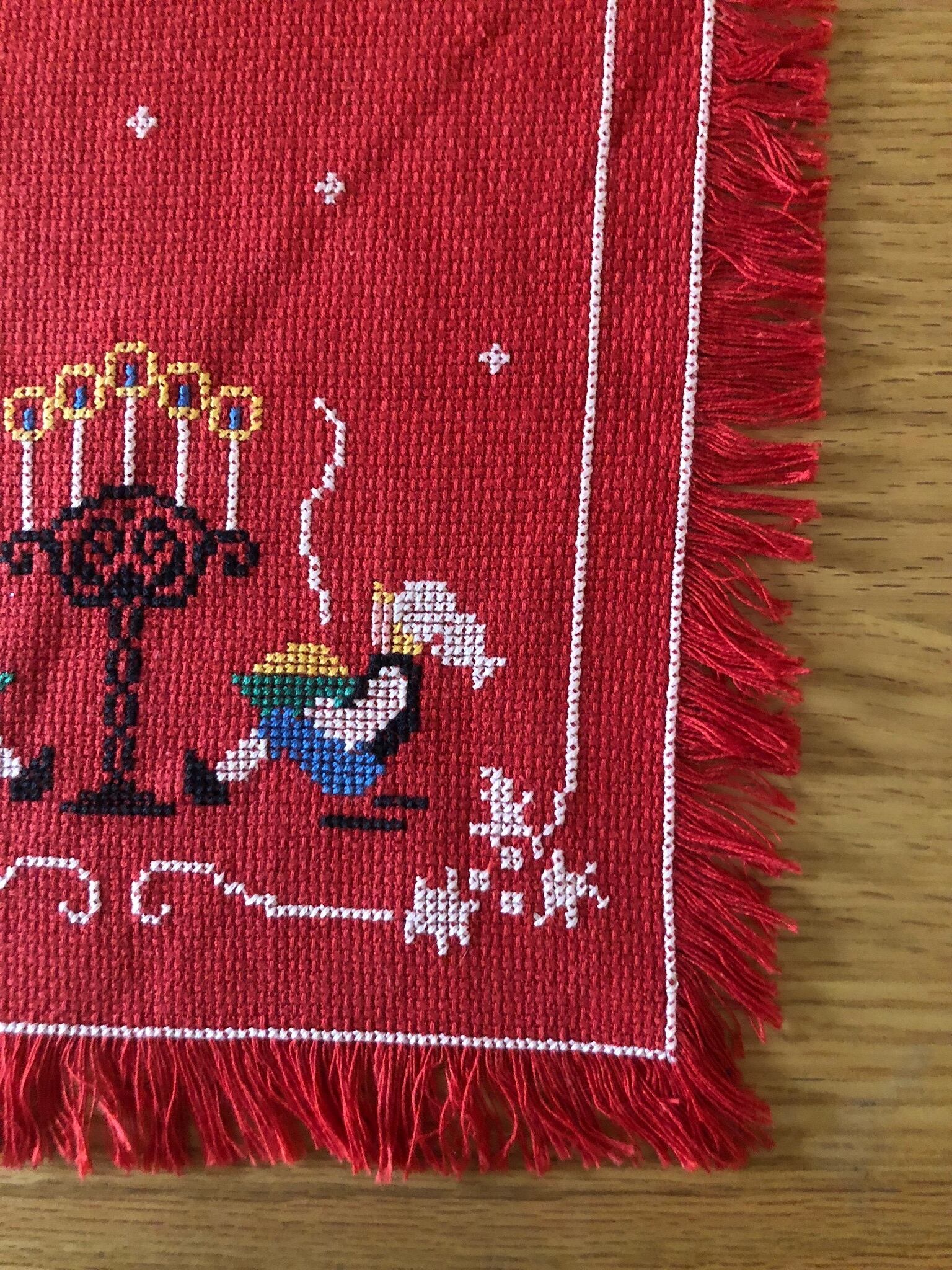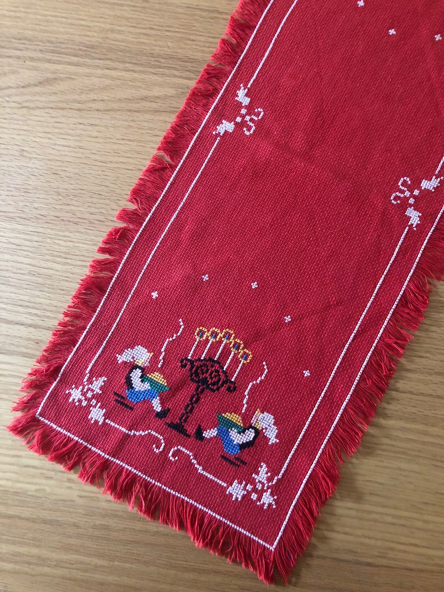 赤の生地に、スカートをはいた女の子のトムテと、燭台とロウソクの刺繍が可愛らしいクリスマスのクロス。回りのフリンジがまたポイント♫