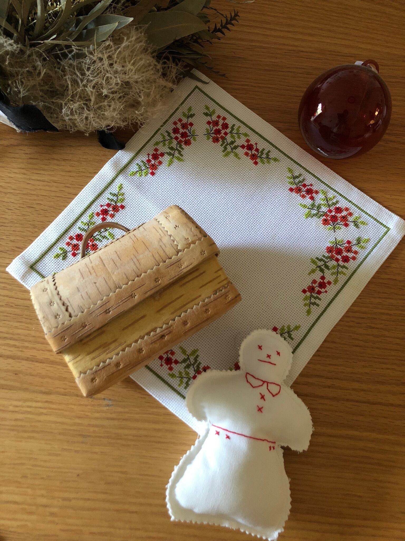 ♫クリスマス3点セット♫ 白樺キャニスター 刺繍クロス ジンジャーマンオーナメント