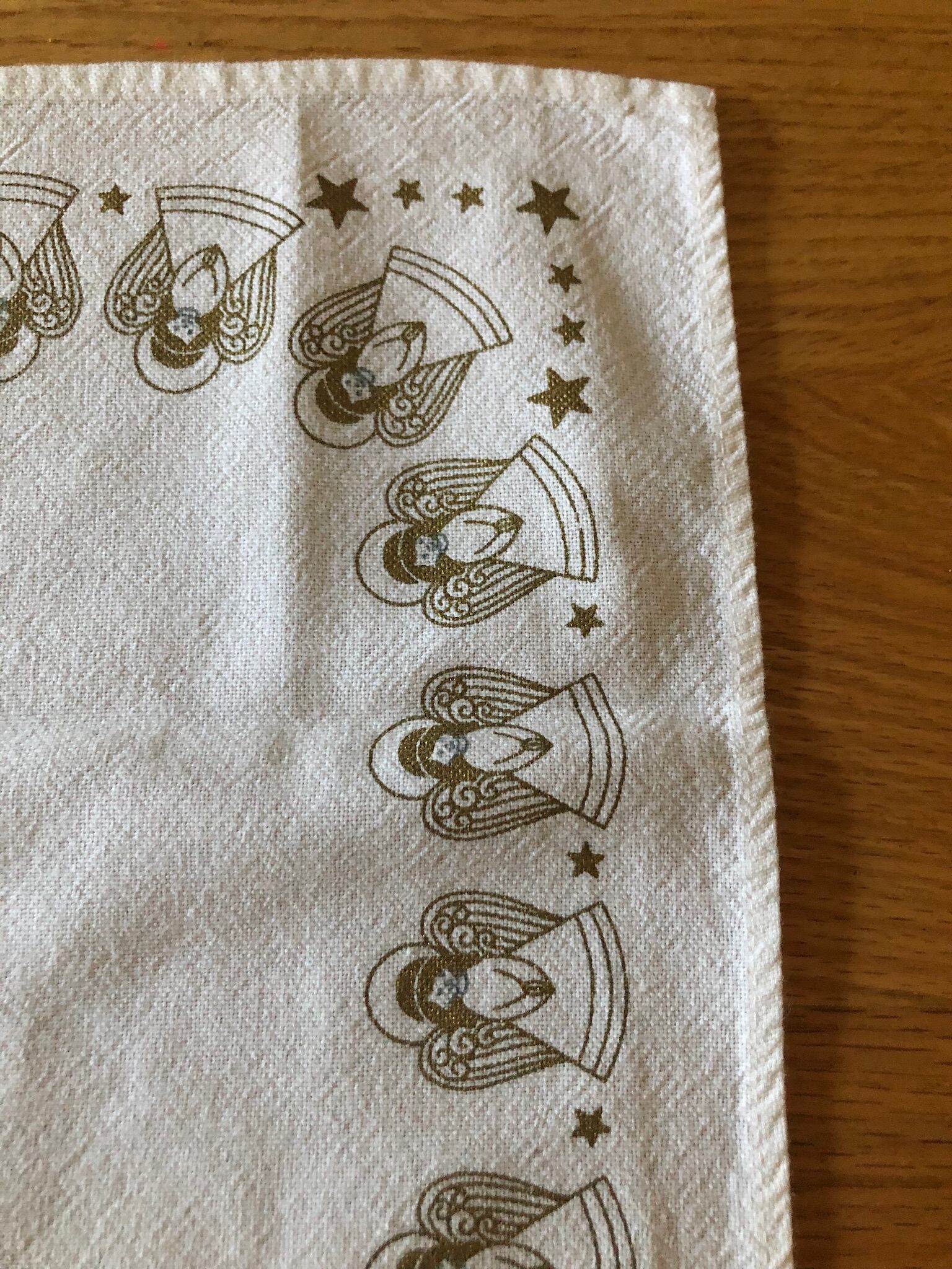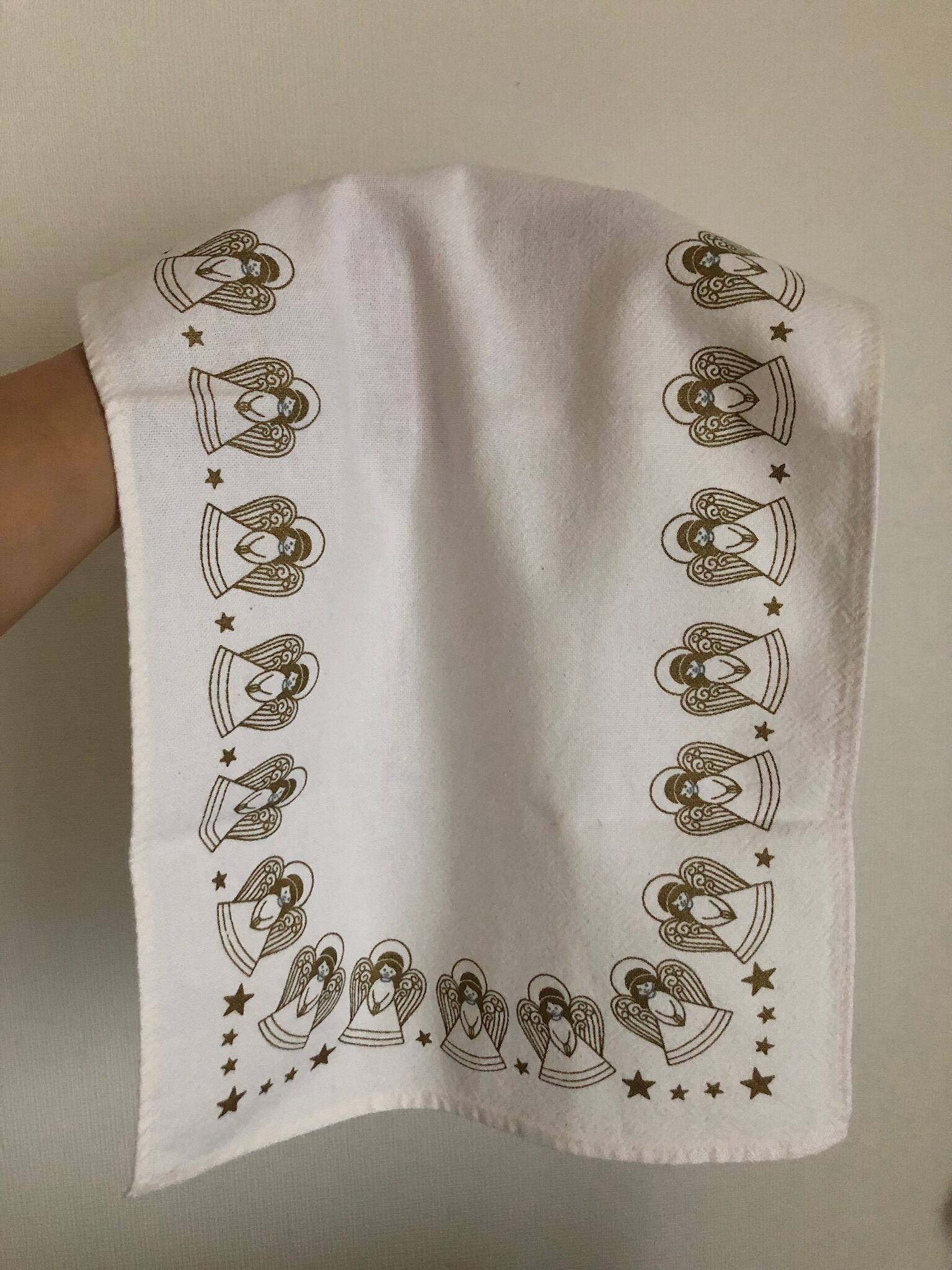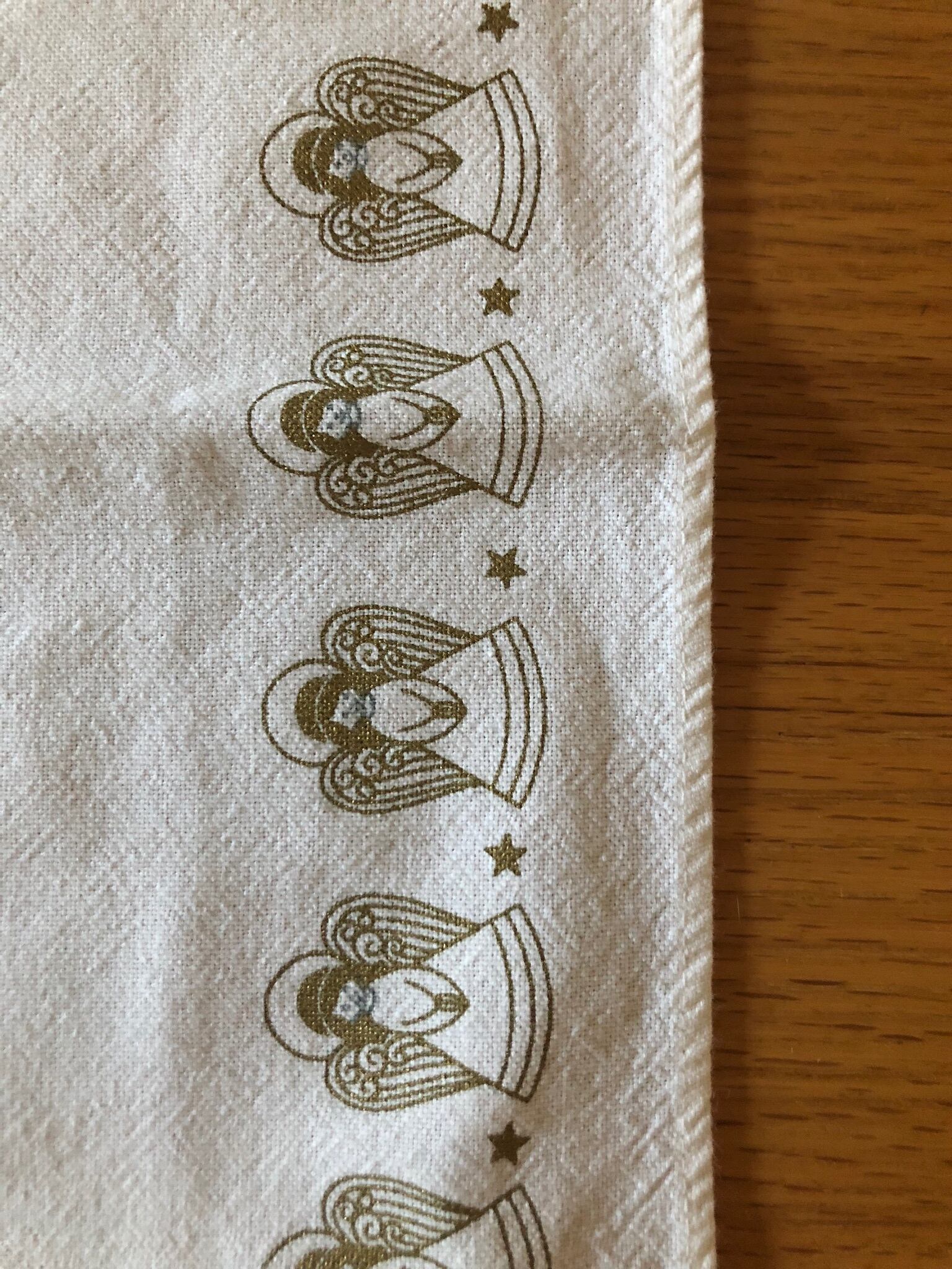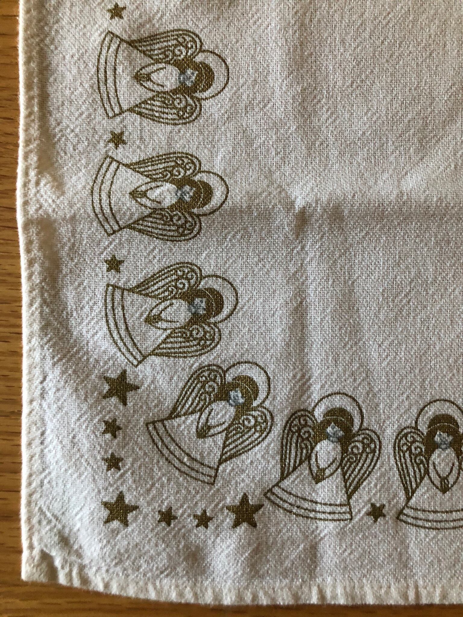 白いコットン生地に、たくさんの天使と星の絵柄が可愛らしいクロスになります。