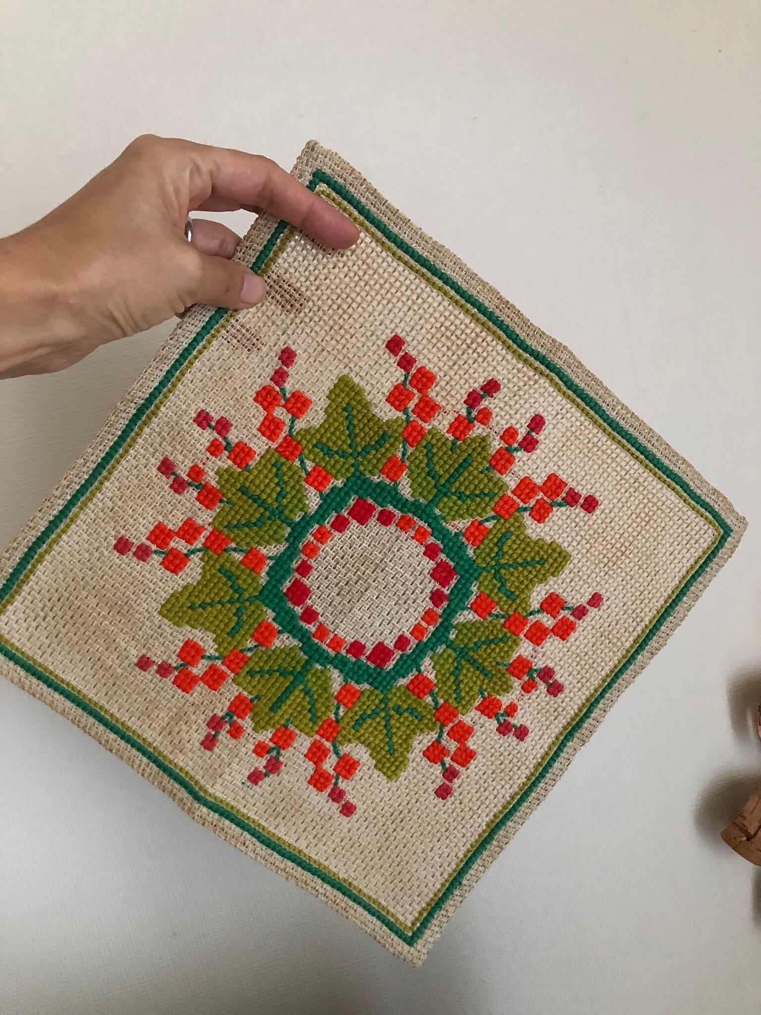 張りのあるざっくりしたリネン生地に、赤とオレンジの実、グリーンの、大きなクリスマスリース刺繍が、クリスマスらしく、可愛らしいクロスです。
