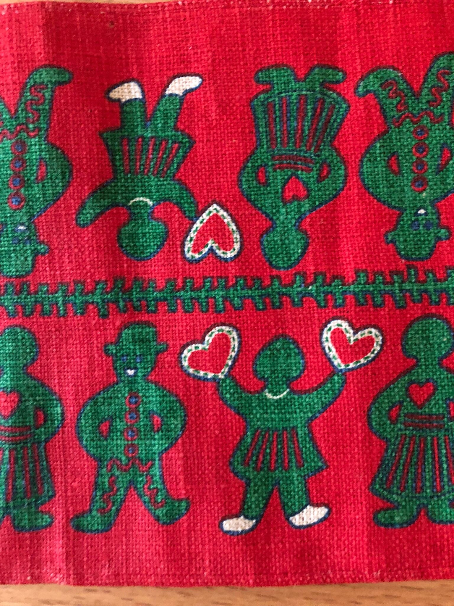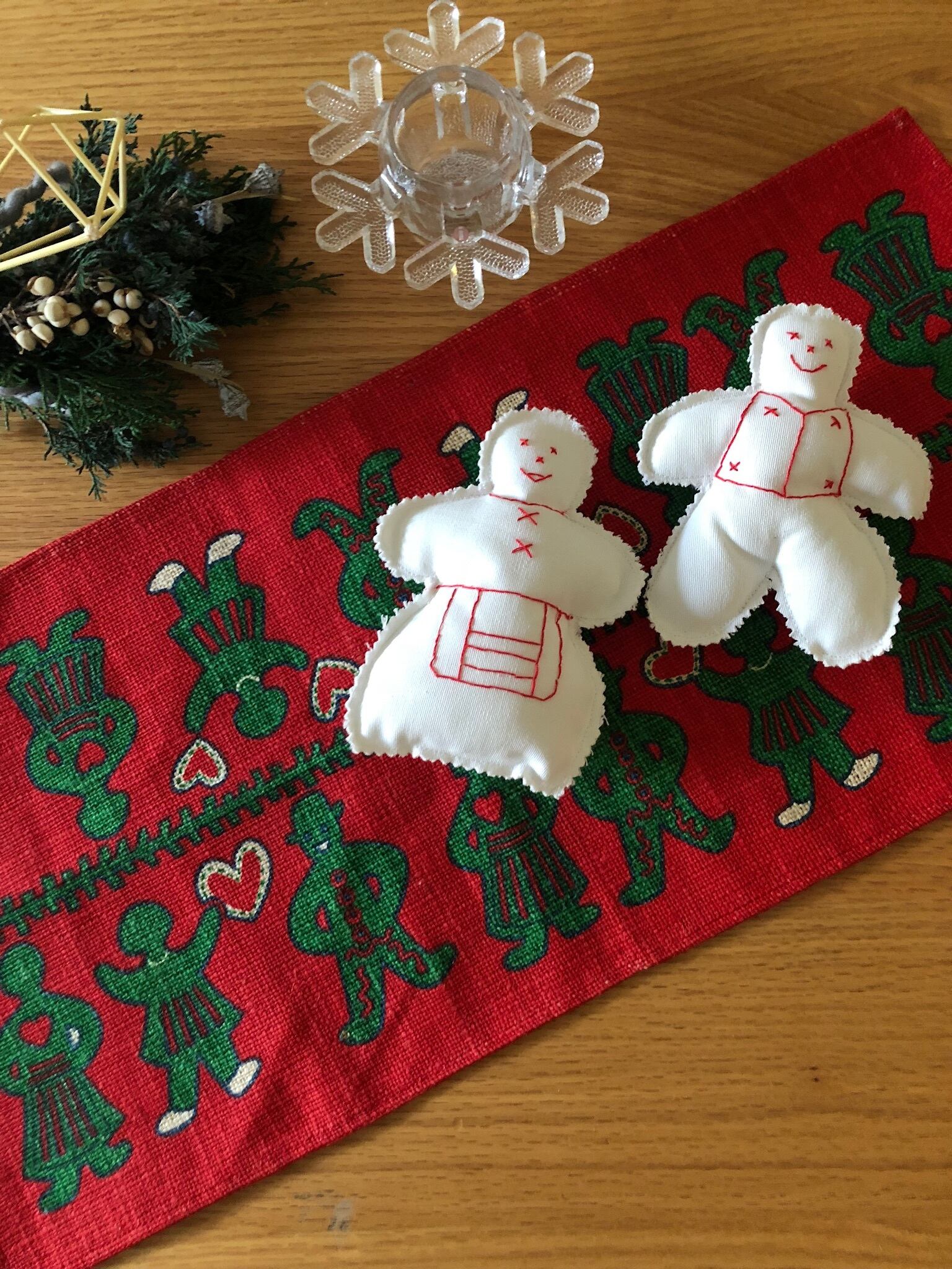 張りのあるリネン生地に、男の子と女の子のジンジャーブレッドのプリントがクリスマスらしくて可愛らしい1枚です♫