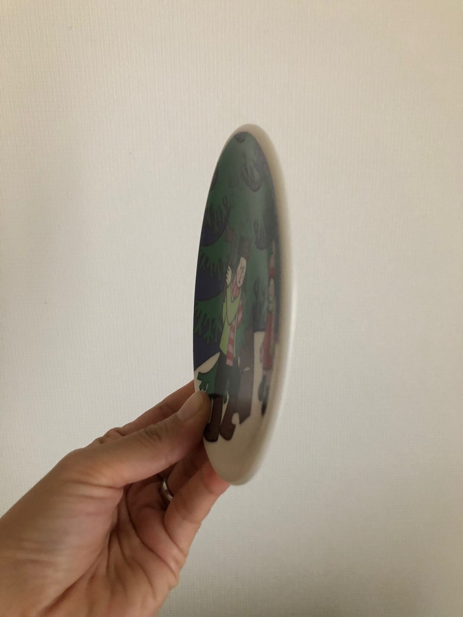 クリスマスに備えて、モミの木を切ろうとしているお兄さんでしょうか?と女の子の絵柄が可愛らしいミニプレートです。