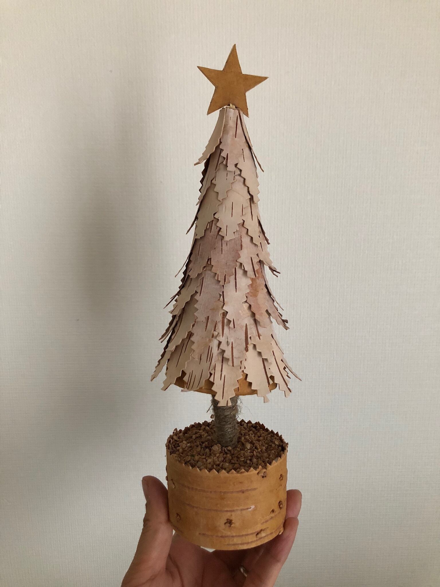 白樺の樹皮を重ねて作れられたとても凝った、白樺のツリー。木の幹は麻紐でしっかり巻かれており、鉢に入ったツリーと星がとても可愛らしいツリーのオブジェです。
