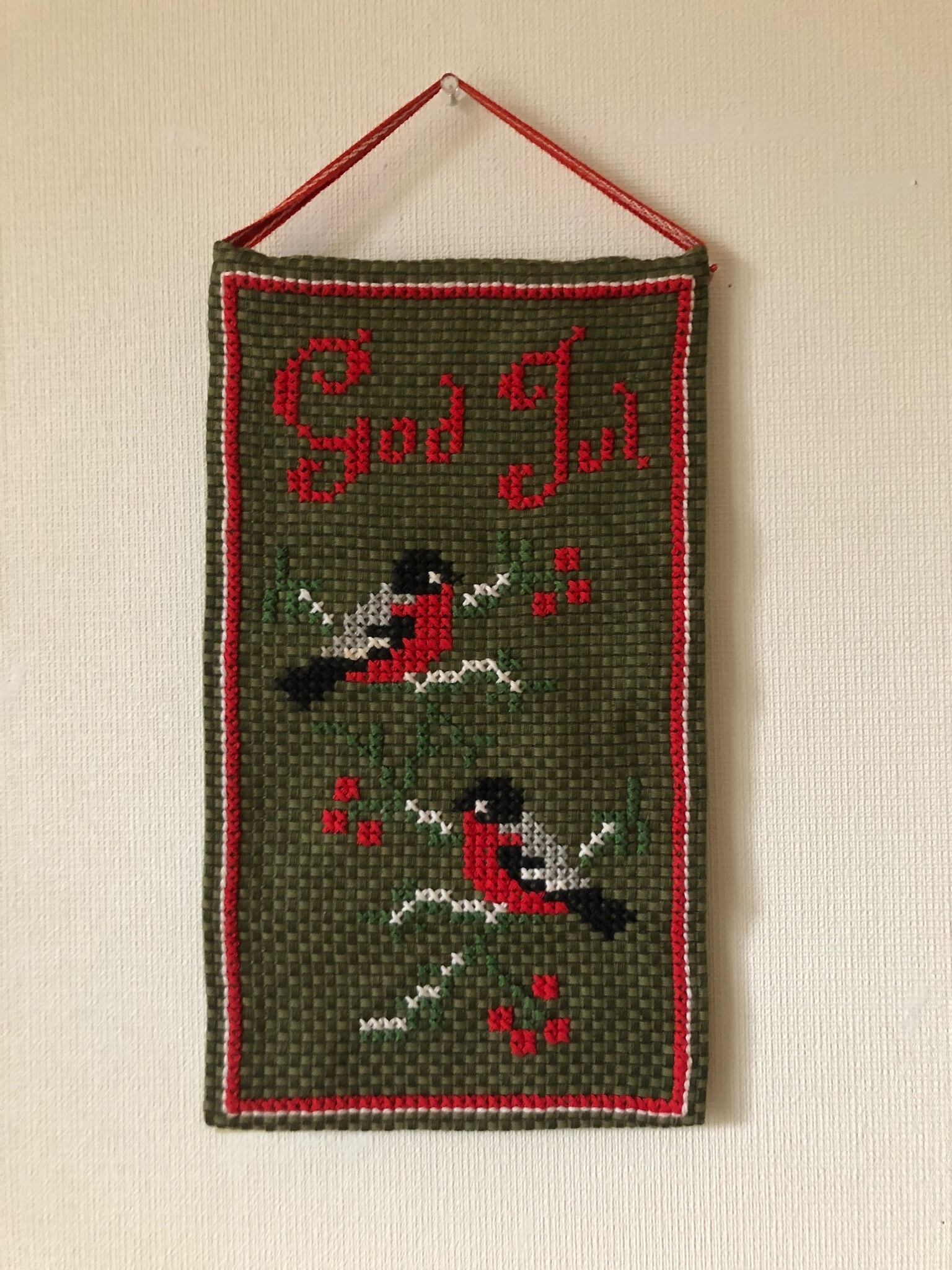 北欧 コマドリと赤い実の刺繍 クリスマスタペストリー ヴィンテージ